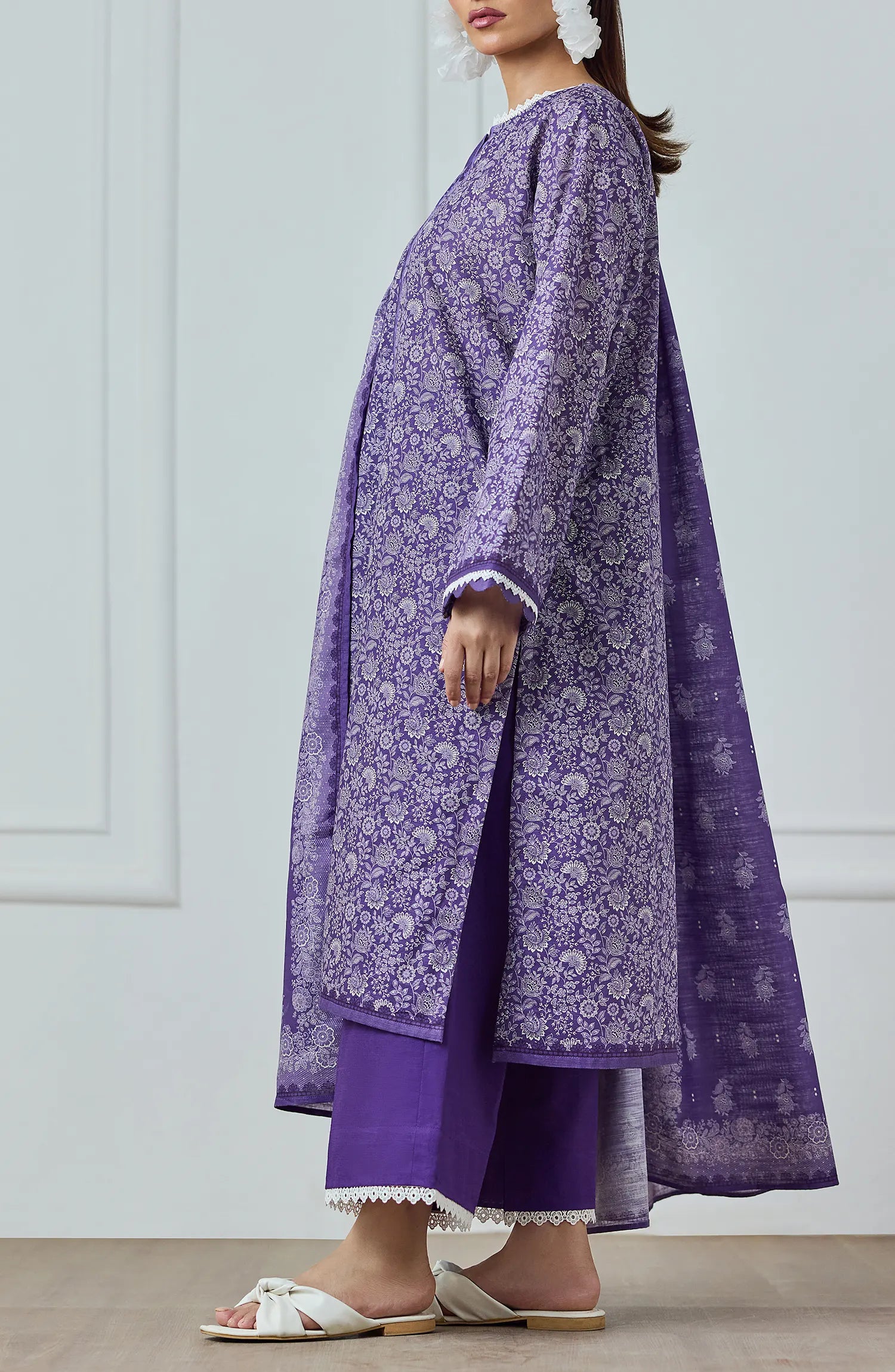 Experience effortless elegance with this 3-piece printed lawn ensemble, including a shirt, dupatta, and trouser. Crafted from lightweight, breathable fabric, it offers comfort ideal for warm days while maintaining a refined silhouette. The carefully detailed prints add a touch of sophistication, making it perfect for both casual gatherings and formal occasions.