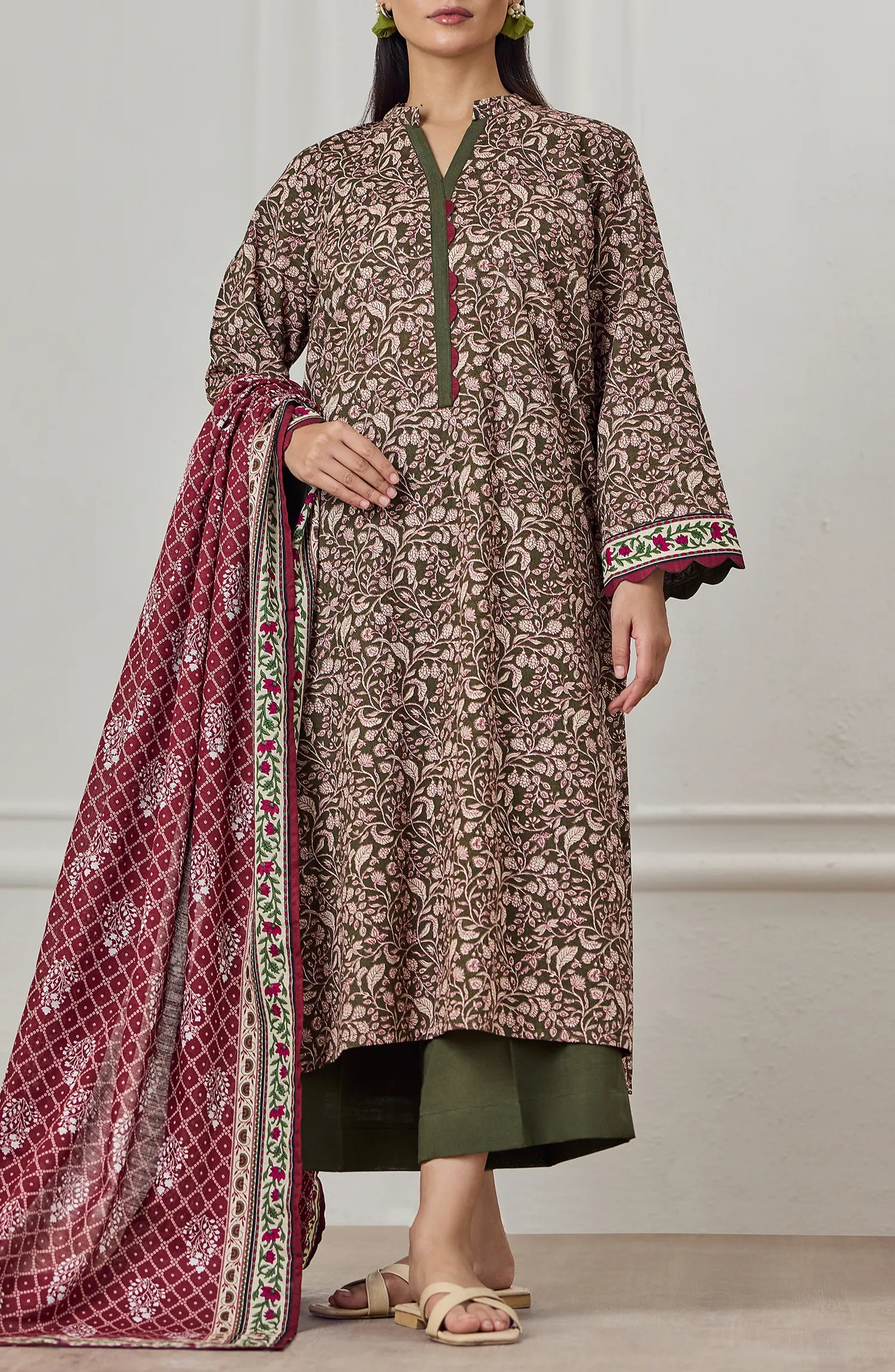 Experience effortless elegance with this 3-piece printed khadar ensemble, including a shirt, dupatta, and trouser. Crafted from lightweight, breathable fabric, it offers comfort ideal for warm days while maintaining a refined silhouette. The carefully detailed prints add a touch of sophistication, making it perfect for both casual gatherings and formal occasions.