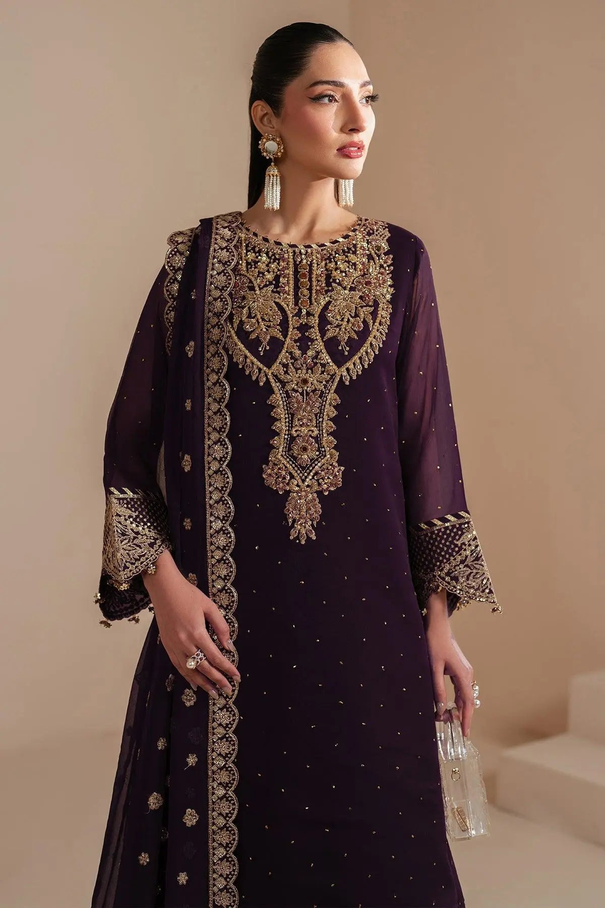 Sirus is a stunning ensemble made from rich deep purple chiffon, adorned with delicate hand embellishments, intricate embroidery, and shimmering light gold sequins. The look is complemented by russian grid trousers featuring an embroidered border, perfectly balancing the opulence of the chiffon dupatta. This exquisite outfit is the perfect choice for Eid celebrations.