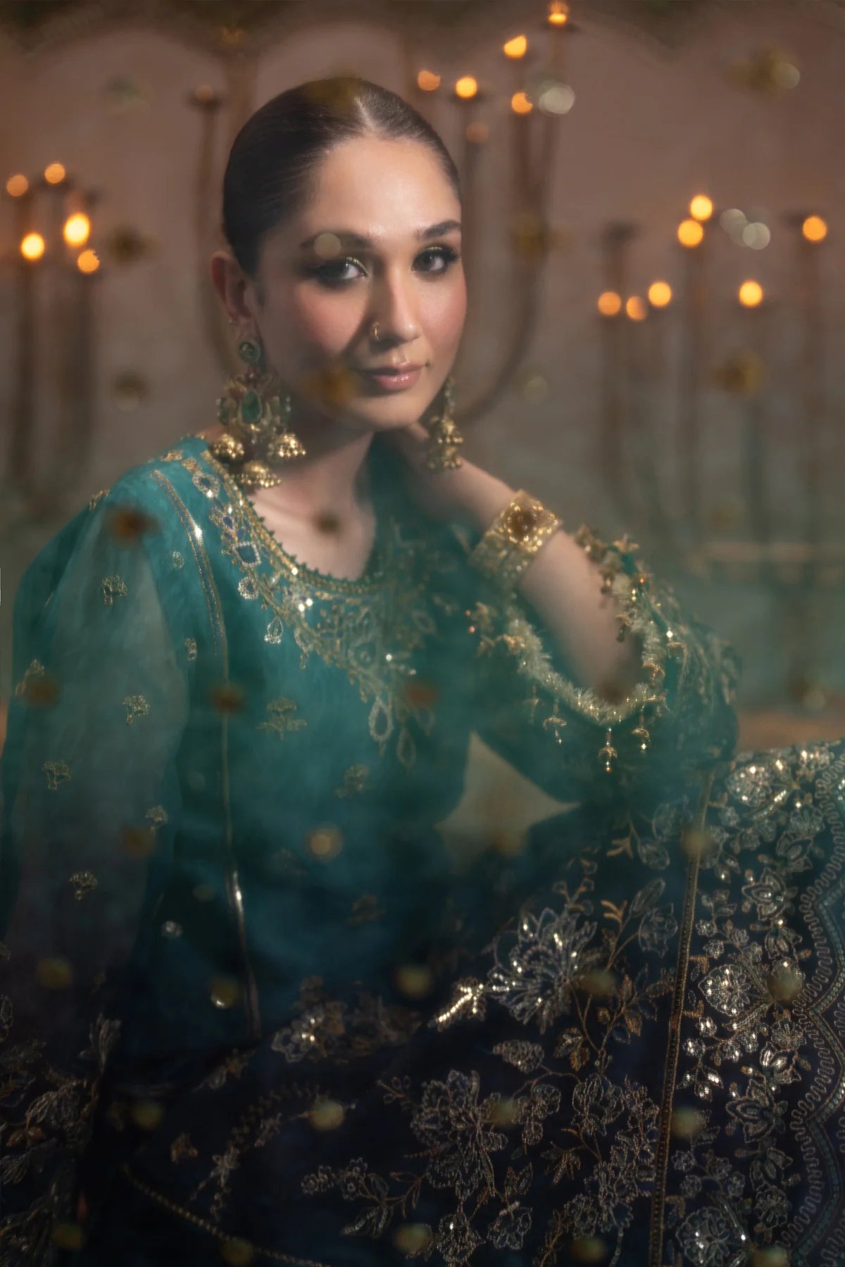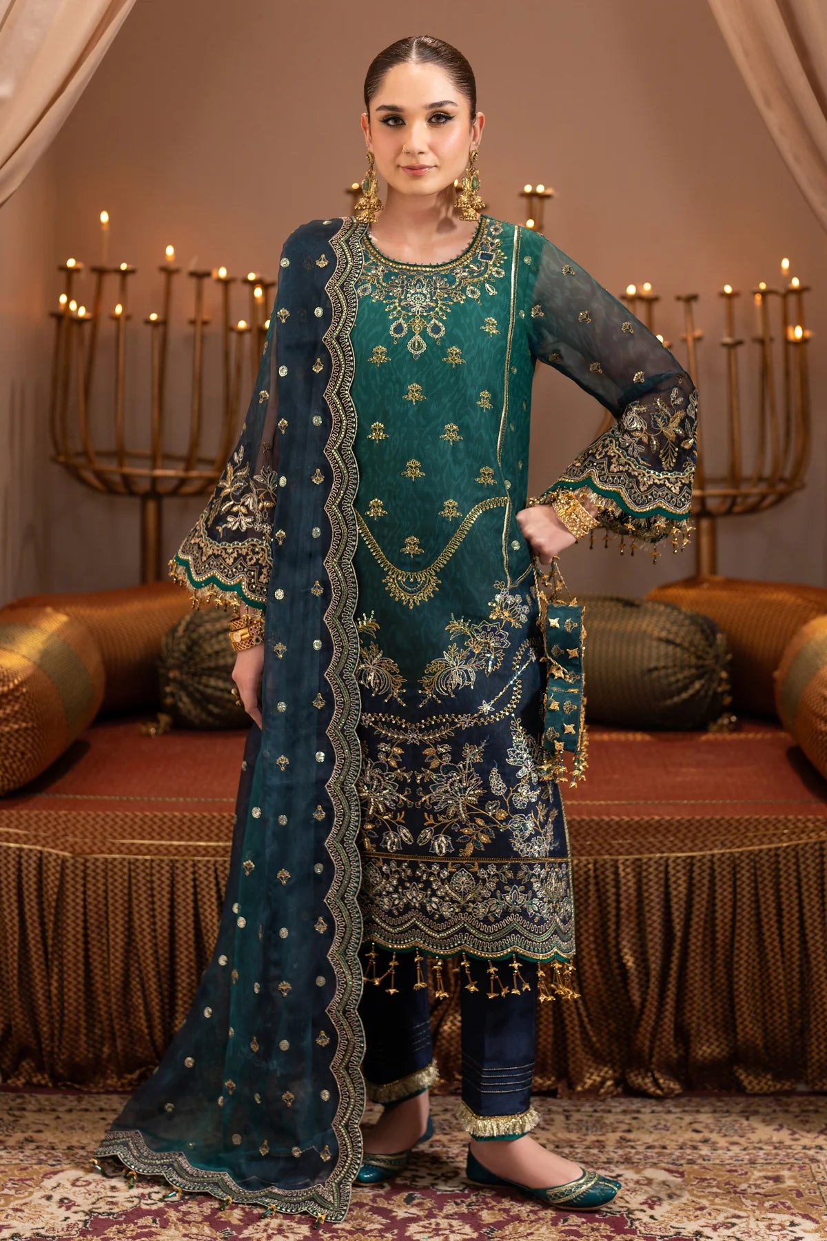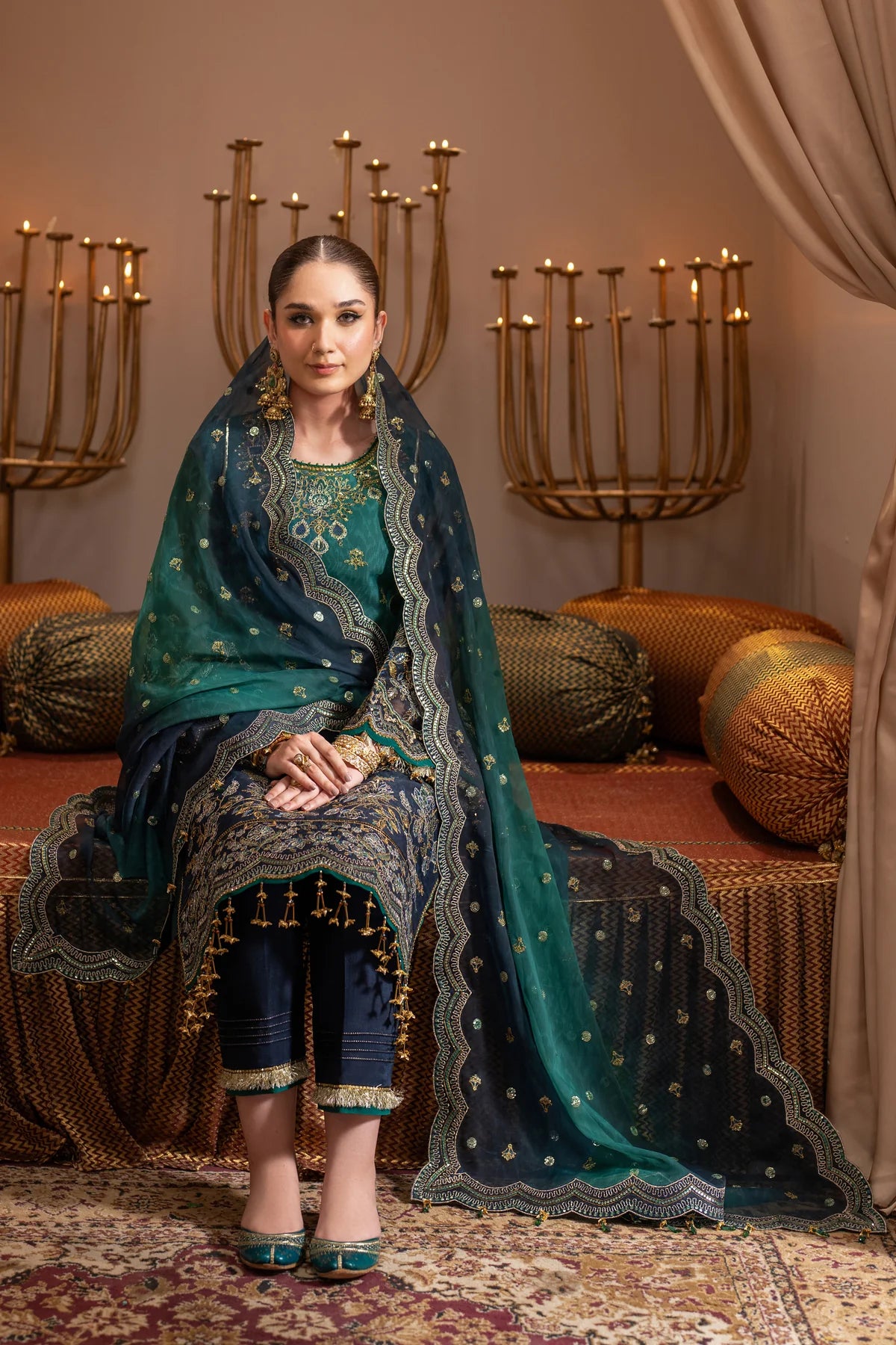 Dewaani is a stunning ensemble that combines zinc and dark green on a breathable chiffon base. It features beautiful embroidery on the neckline, along with intricate motifs on the borders and sleeves. The outfit is completed with a shaded chiffon dupatta adorned with embroidery and paired with raw silk trousers.k trousers.