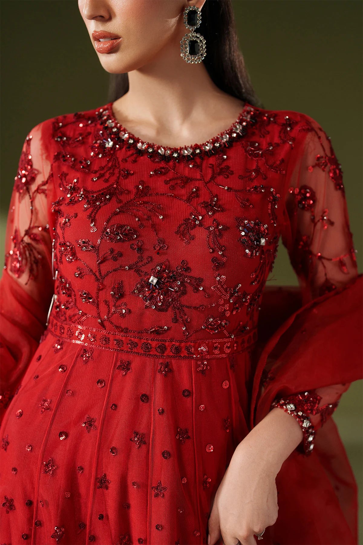 - Stitched includes Shirt, Lining, Dupatta and Trouser all embellished as shown in pictures.