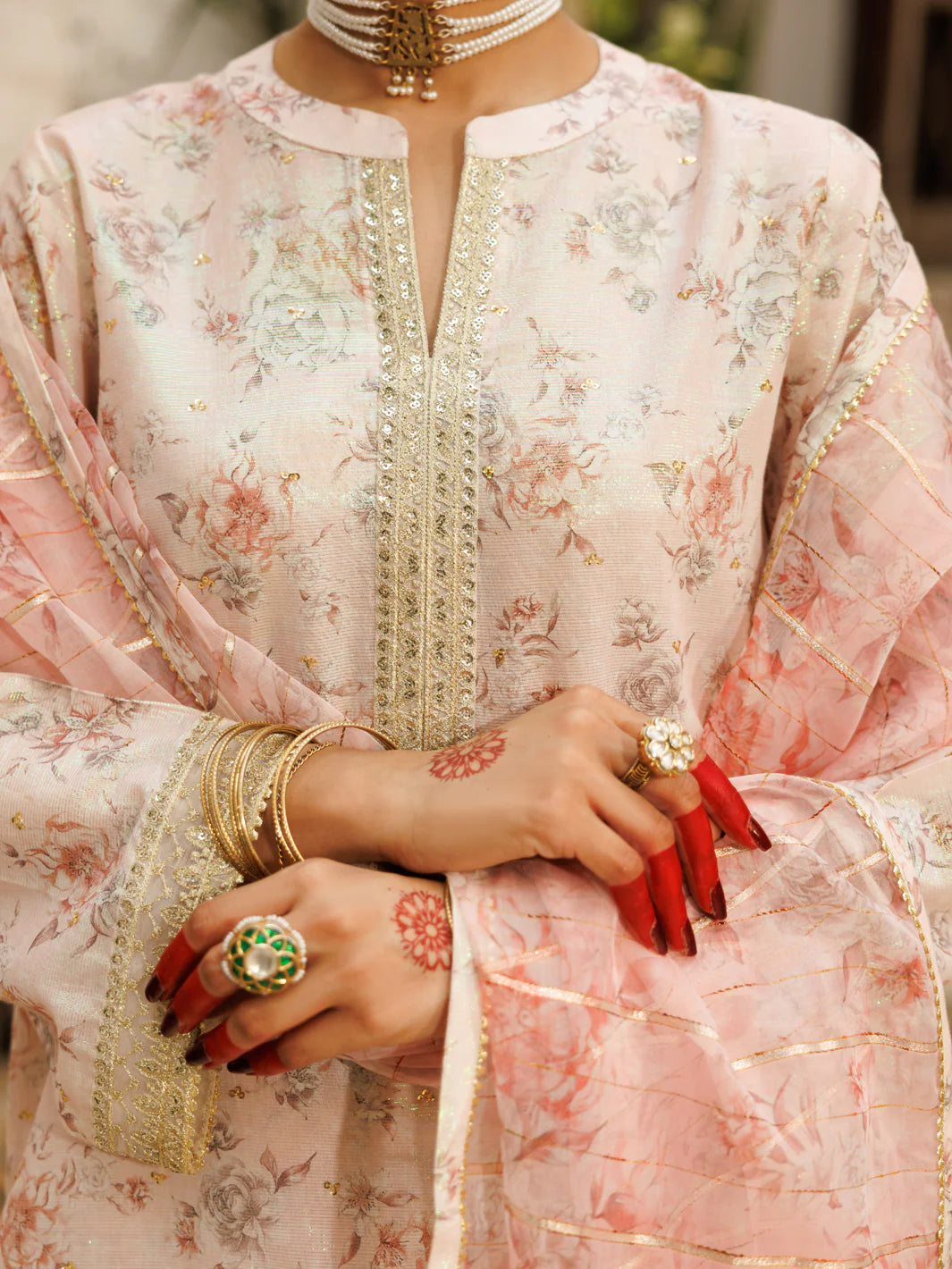 Elevate your everyday elegance with this light pink 3-piece suit from Almirah’s latest summer range. Featuring a beautifully printed lurex viscose short shirt with delicate embroidery, it comes paired with a matching farshi shalwar and a printed zari khadi dupatta — a perfect blend of comfort and festive charm.