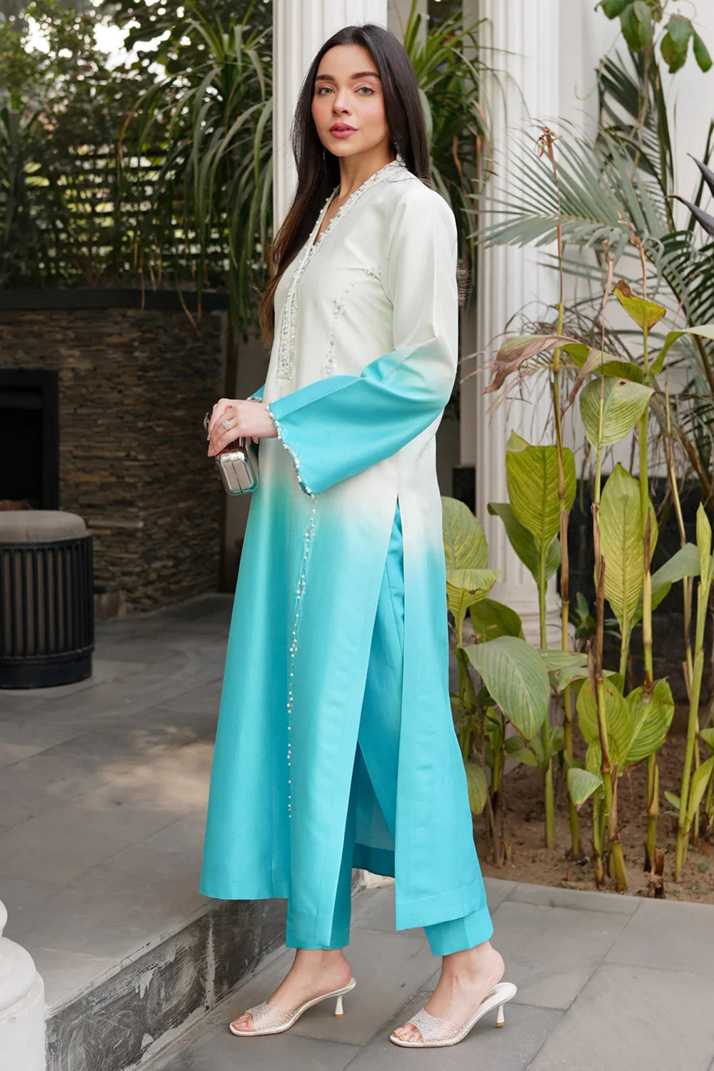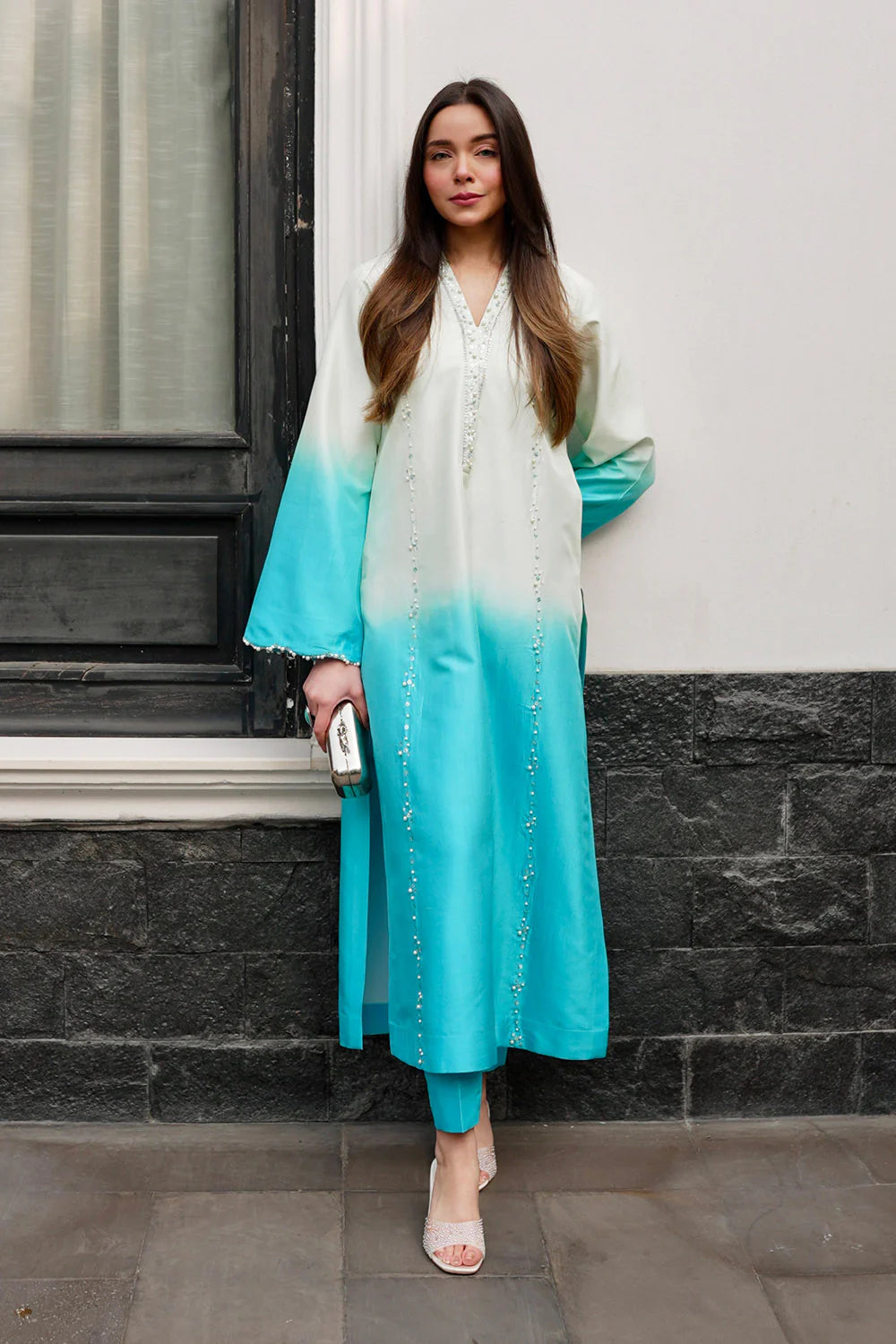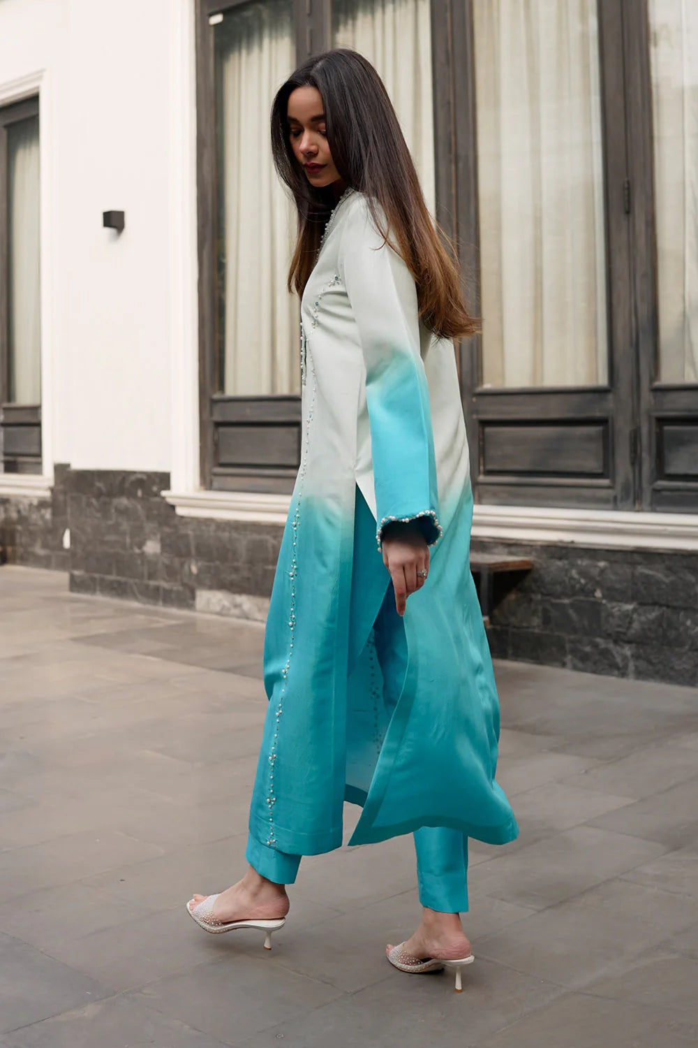 Radiating timeless elegance and refined sophistication, this exquisite ensemble features a long A-line shirt paired with sleek cigarette pants, meticulously crafted to flatter the modern silhouette. The shirt, fashioned from luxurious tissue Korean silk, drapes gracefully with an ethereal lightness and a subtle, luminous sheen, while the matching trousers in the same refined fabric complete the look with tailored finesse. Every inch of this creation glimmers with the artistry of hand-applied satin Swarovski crystals, sequins, and delicate pearls—each embellishment thoughtfully placed to catch the light with effortless allure. This ensemble is a sublime expression of high fashion, where opulence meets grace, capturing the essence of elevated femininity and modern glamour.