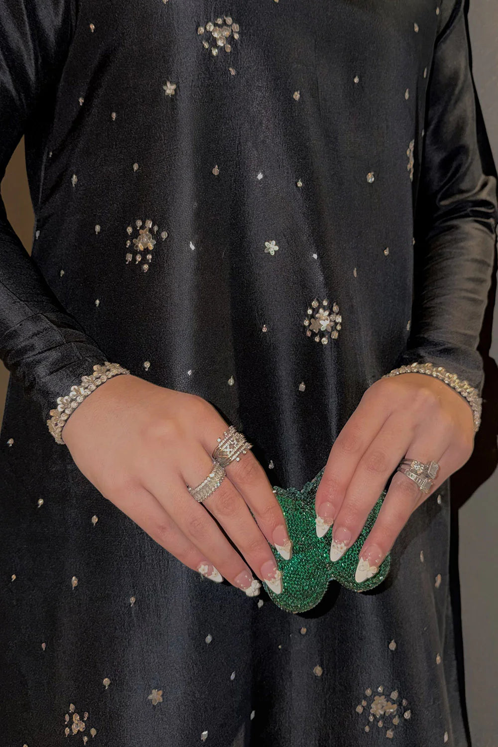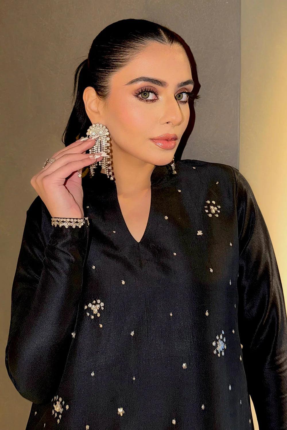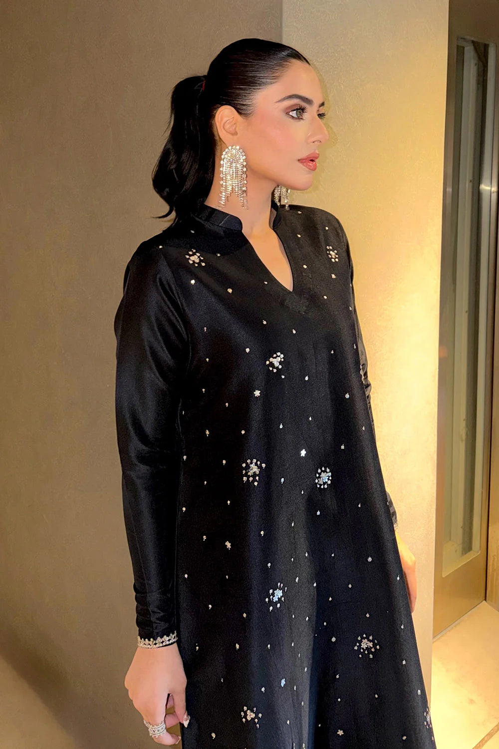 This refined ensemble features a long A-line shirt tailored from luxurious tissue Korean silk, offering an airy yet structured silhouette that exudes understated opulence. Paired with sleek cigarette pants crafted in matching tissue Korean silk, the look is elevated through its clean lines and contemporary finesse. The design is lavishly adorned with hand-applied satin Swarovski elements, shimmering crystals, and delicate sequins that catch the light with every movement, adding a subtle couture sparkle. Completing the ensemble is an ethereal georgette chiffon dupatta, draping effortlessly to lend softness and contrast, resulting in a harmonious blend of modern elegance and timeless designer sophistication.