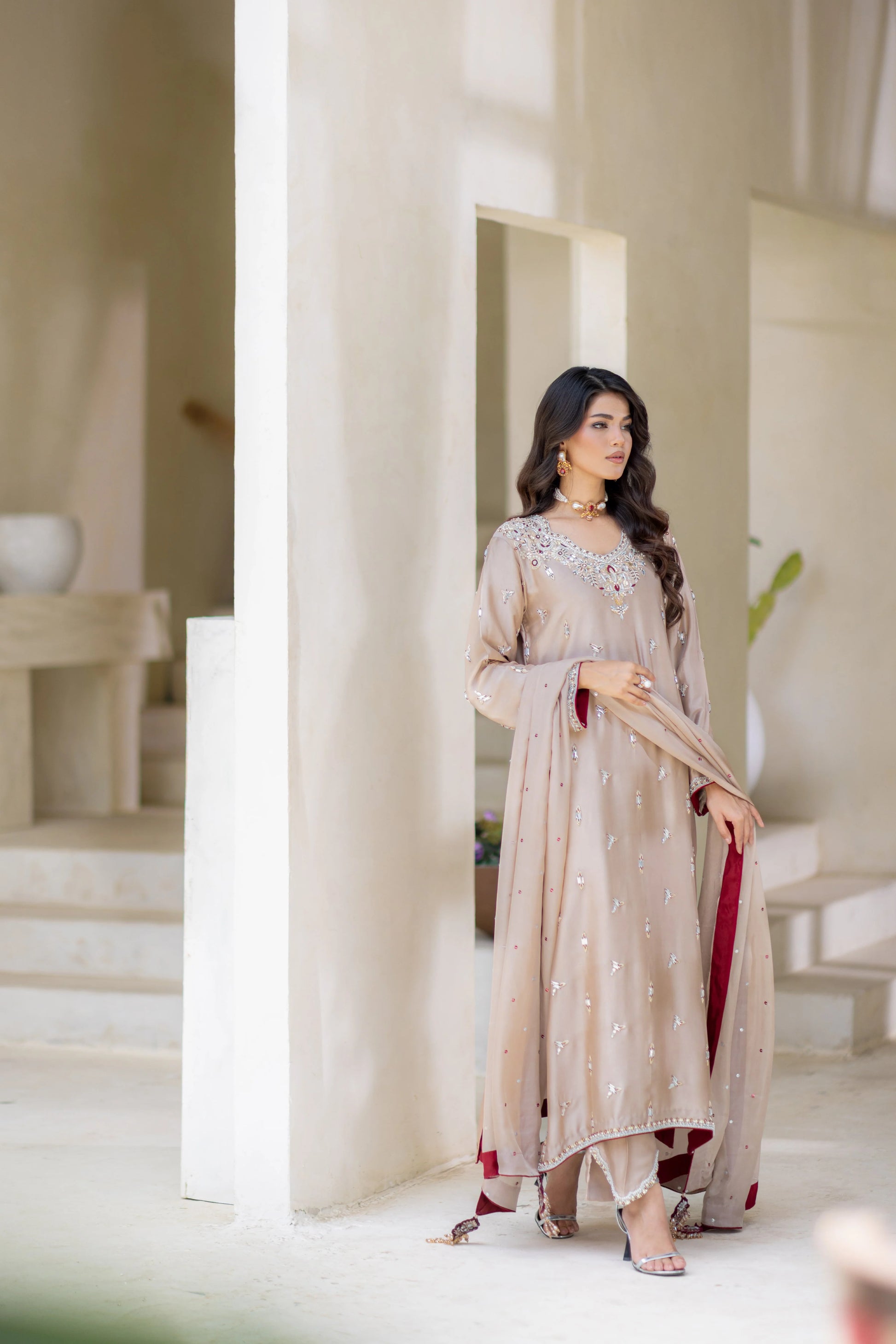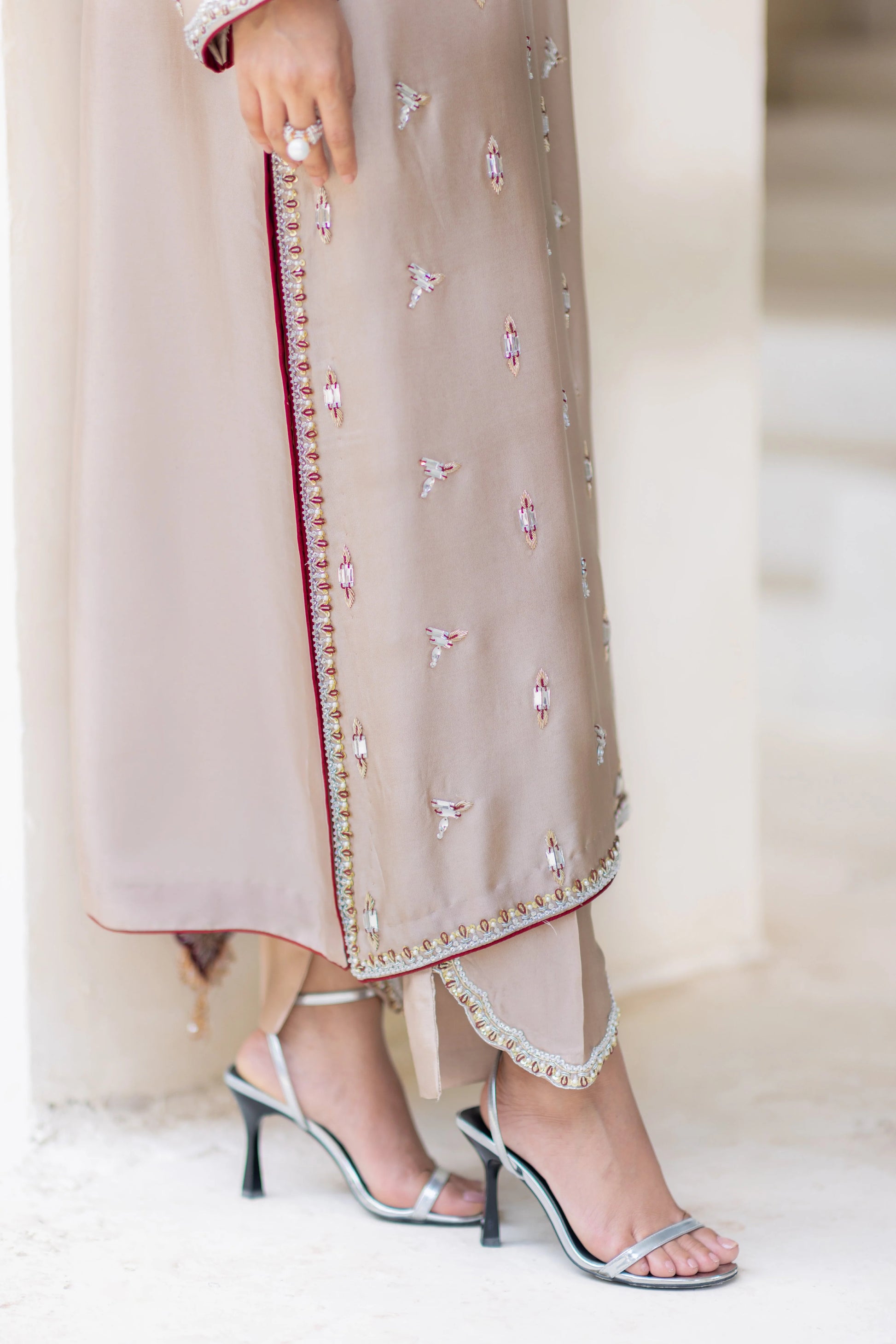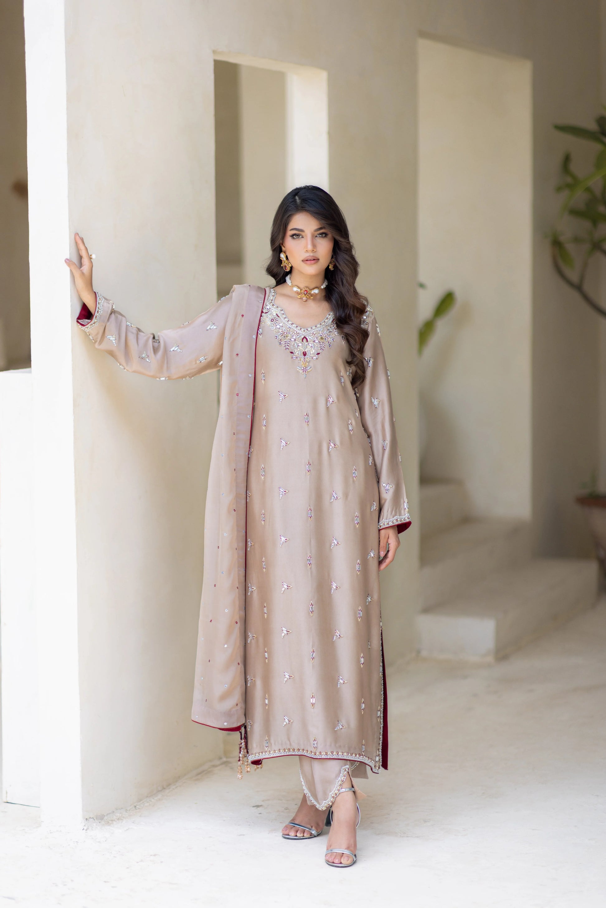 Delicate Elegance in Taupe – This sophisticated ensemble features a pure silk shirt paired with tailored scalloped-cut pants and a luxurious chiffon dupatta. The shirt boasts a beautifully scalloped V-shaped neckline, adorned with intricate hand-stitched stonework motifs and maroon zardozi accents, showcasing exceptional craftsmanship. The heavily embellished neckline, sleeves, and side slits further enhance its refined aesthetic. The chiffon dupatta, delicately embellished with chan and 4 sided maroon tassels details, adds a touch of understated shimmer. This ensemble is a timeless blend of elegance and grace, perfect for elevating any occasion.