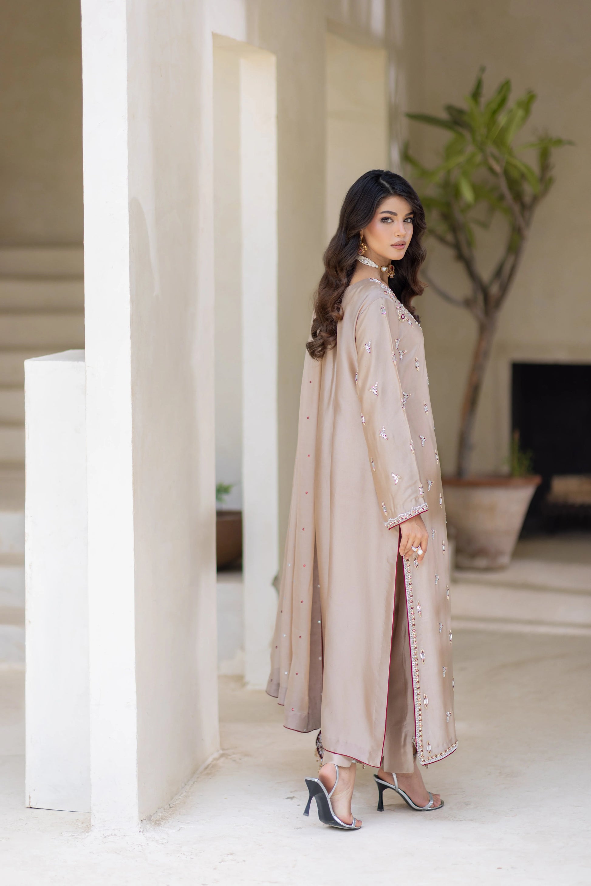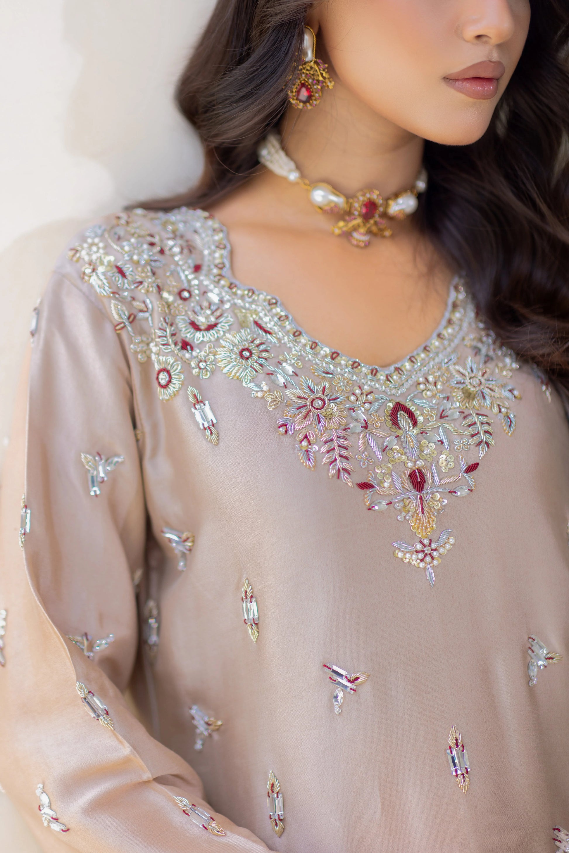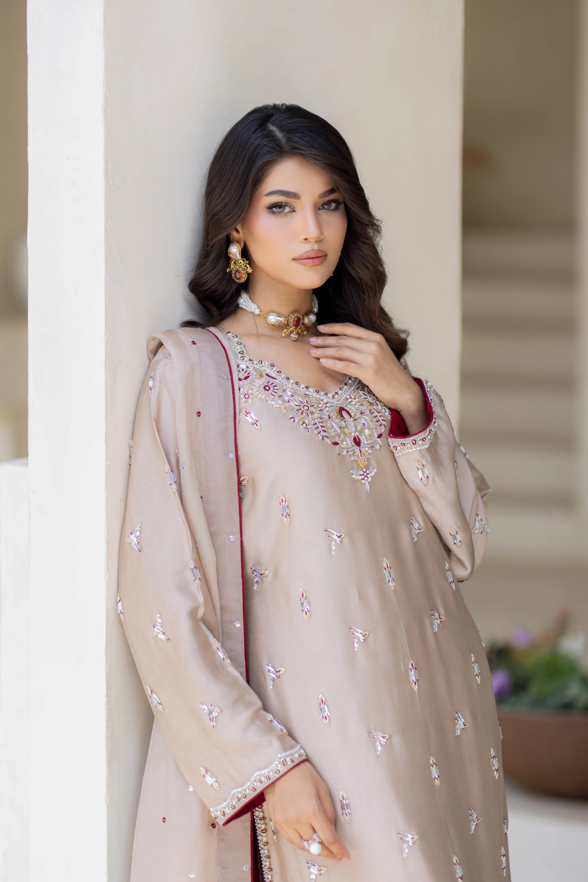 Delicate Elegance in Taupe – This sophisticated ensemble features a pure silk shirt paired with tailored scalloped-cut pants and a luxurious chiffon dupatta. The shirt boasts a beautifully scalloped V-shaped neckline, adorned with intricate hand-stitched stonework motifs and maroon zardozi accents, showcasing exceptional craftsmanship. The heavily embellished neckline, sleeves, and side slits further enhance its refined aesthetic. The chiffon dupatta, delicately embellished with chan and 4 sided maroon tassels details, adds a touch of understated shimmer. This ensemble is a timeless blend of elegance and grace, perfect for elevating any occasion.