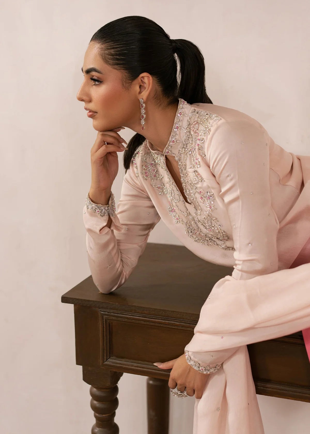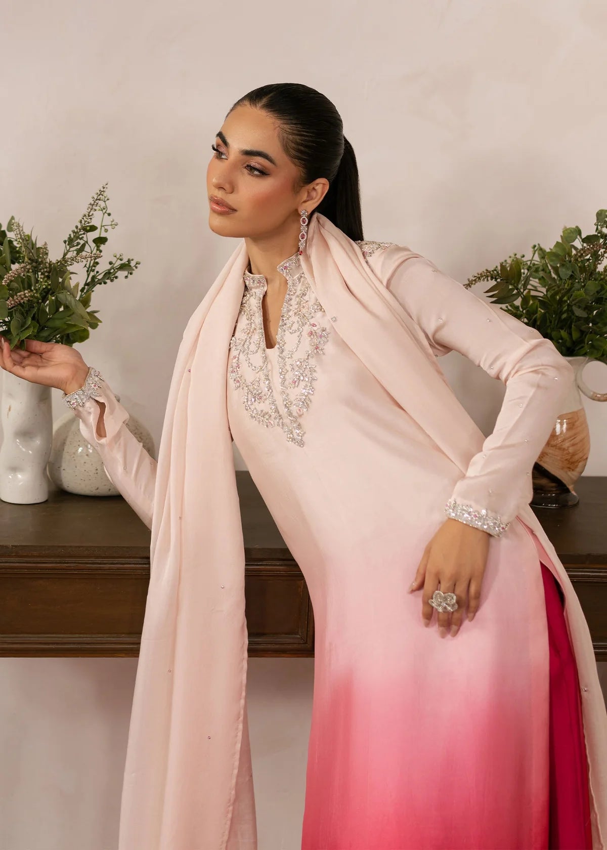Revel in the artistry of ombre. Crafted from tissue silk, both shirt and trouser showcase a seamless gradient of coral and ombre, paired with an organza dupatta for ethereal charm. A statement piece for the contemporary muse.
