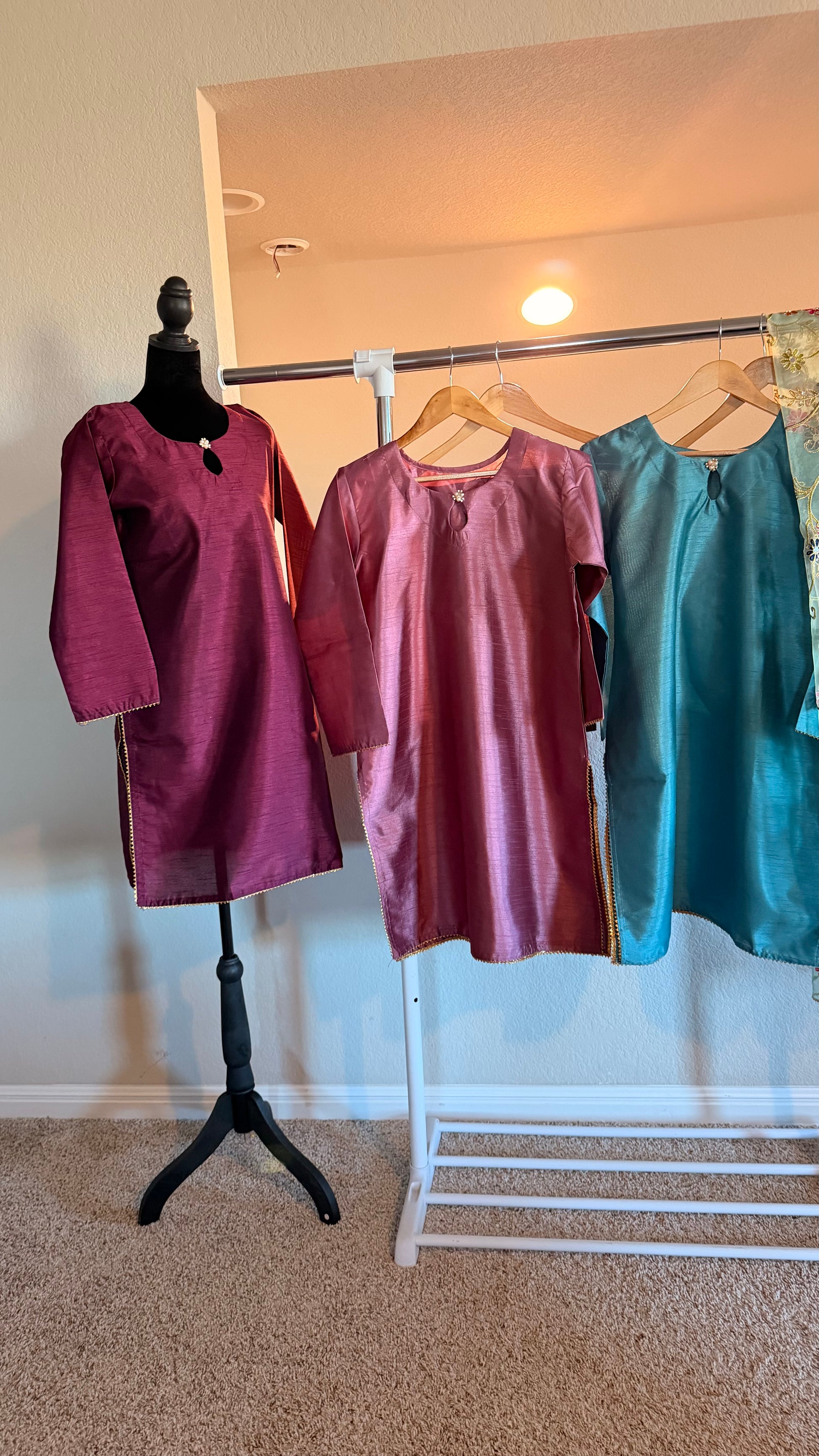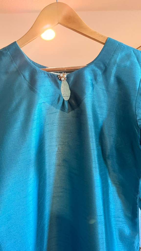 - Matching wide-legged salwar in soft Korean Raw Silk