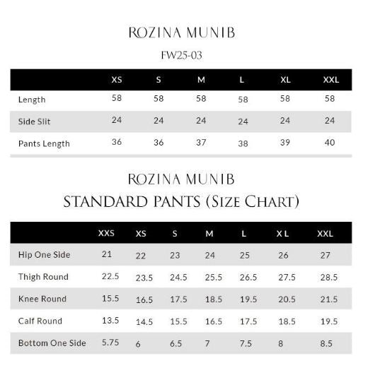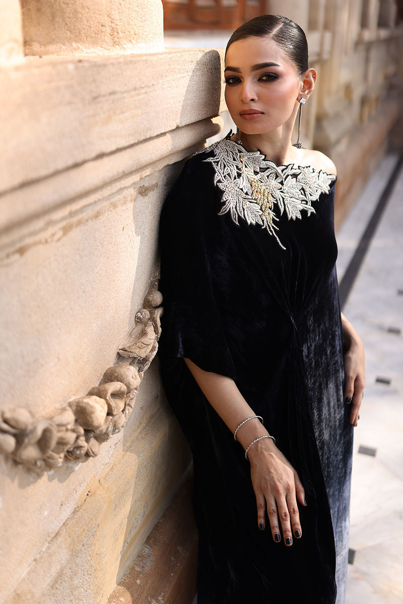 A stunning Black Ombre kaftan crafted from pure velvet, beautifully adorned with intricate silver and gold embroidery featuring zari, moti, nakshi, dabka, cutdana, kaamdani, stones, and crystals on the front and back. The detailed cutwork adds a refined touch of artistry, creating a perfect balance of elegance and opulence. Paired with grey cotton charmeuse pants, this ensemble exudes timeless grace and contemporary sophistication.