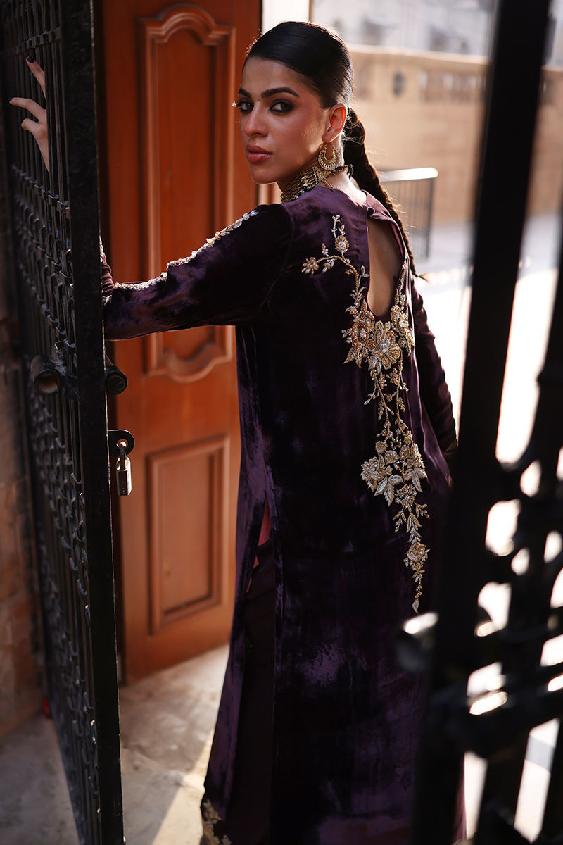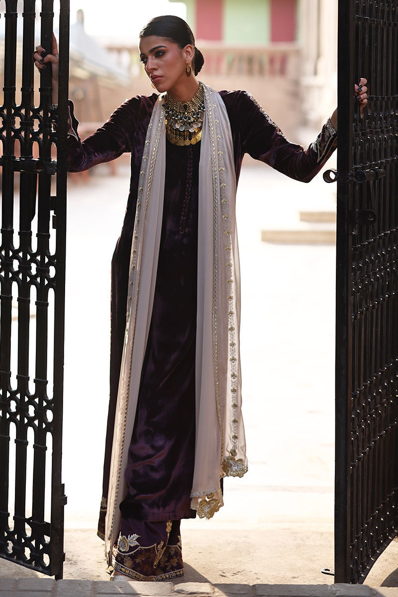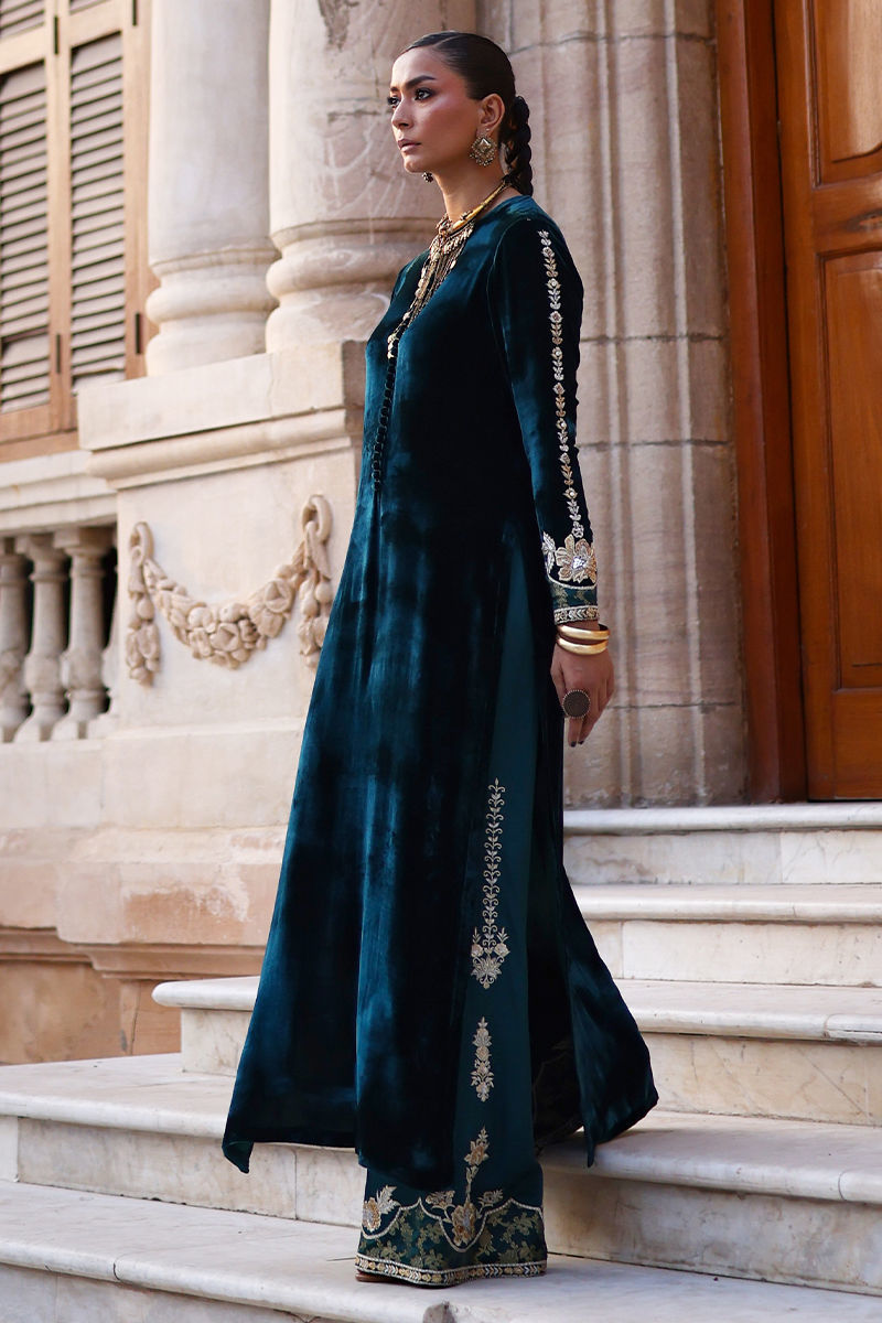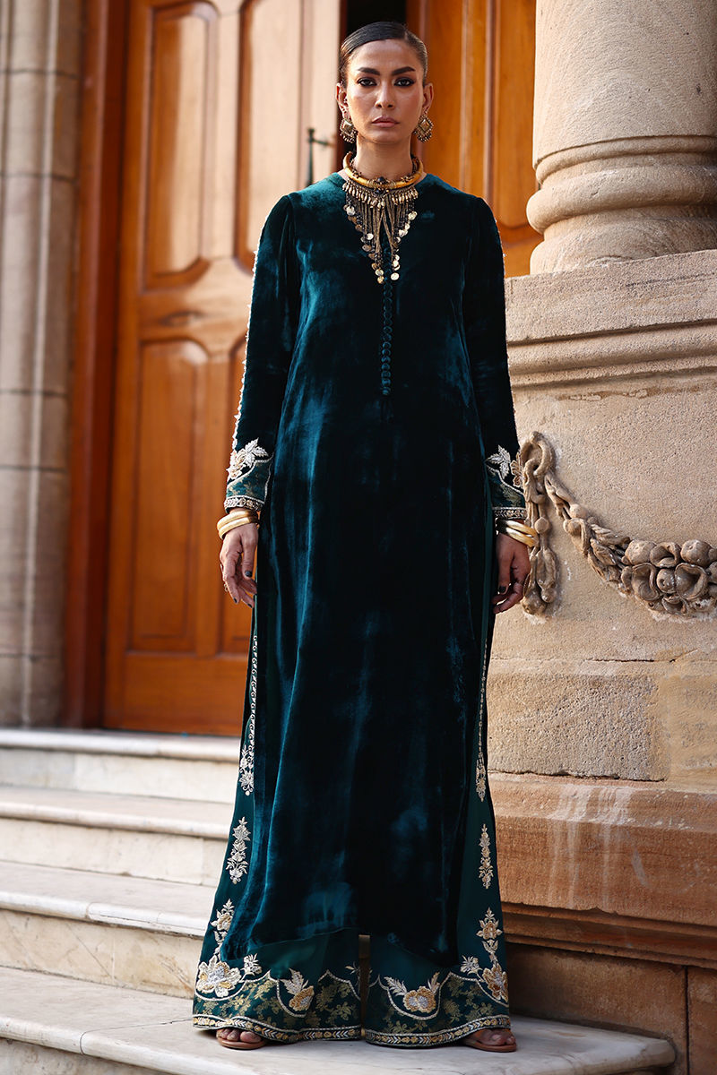 An exquisite emerald green straight long shirt crafted from pure velvet, richly adorned with silver and gold zari embroidery and heavy zardozi work. The intricate detailing features kora, dabka, cutdana, stones, pearls, nakshi, and sequins on the front, back, and sleeves, reflecting timeless craftsmanship. Paired with cotton charmeuse culottes in matching emerald green, enhanced with silver, gold zari, lorix embroidery, and Banarasi appliqué. The look is beautifully completed with a fog beige lame chiffon dupatta, delicately embroidered in gold, silver, and lorix, adding a graceful contrast and regal finish.