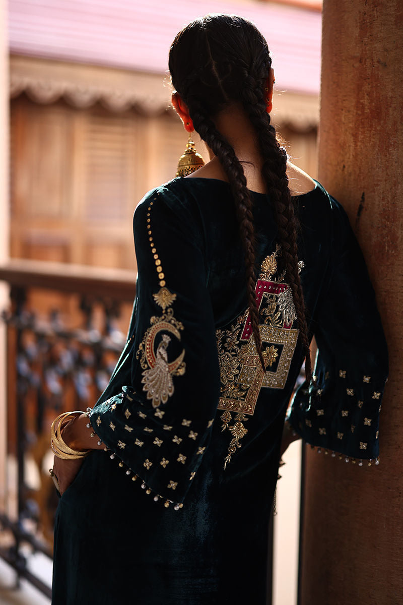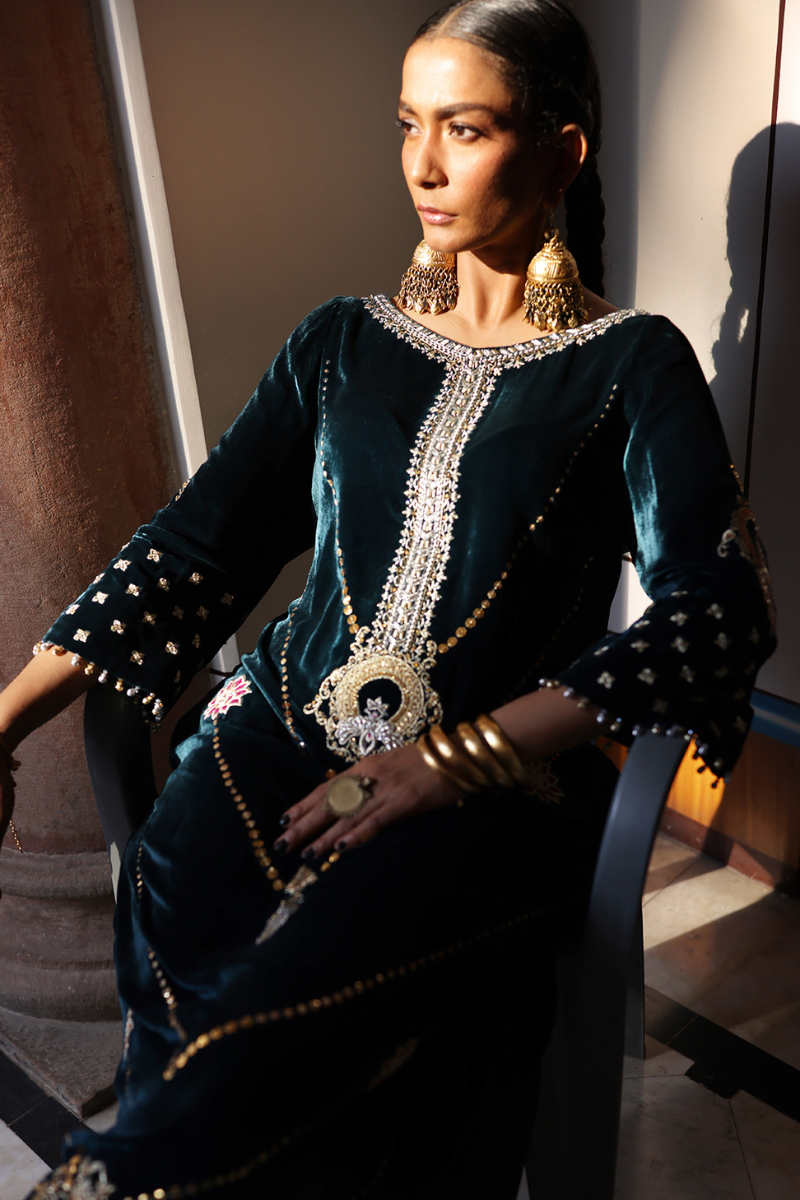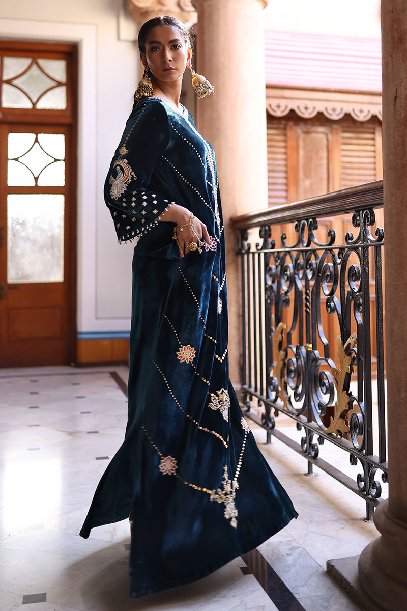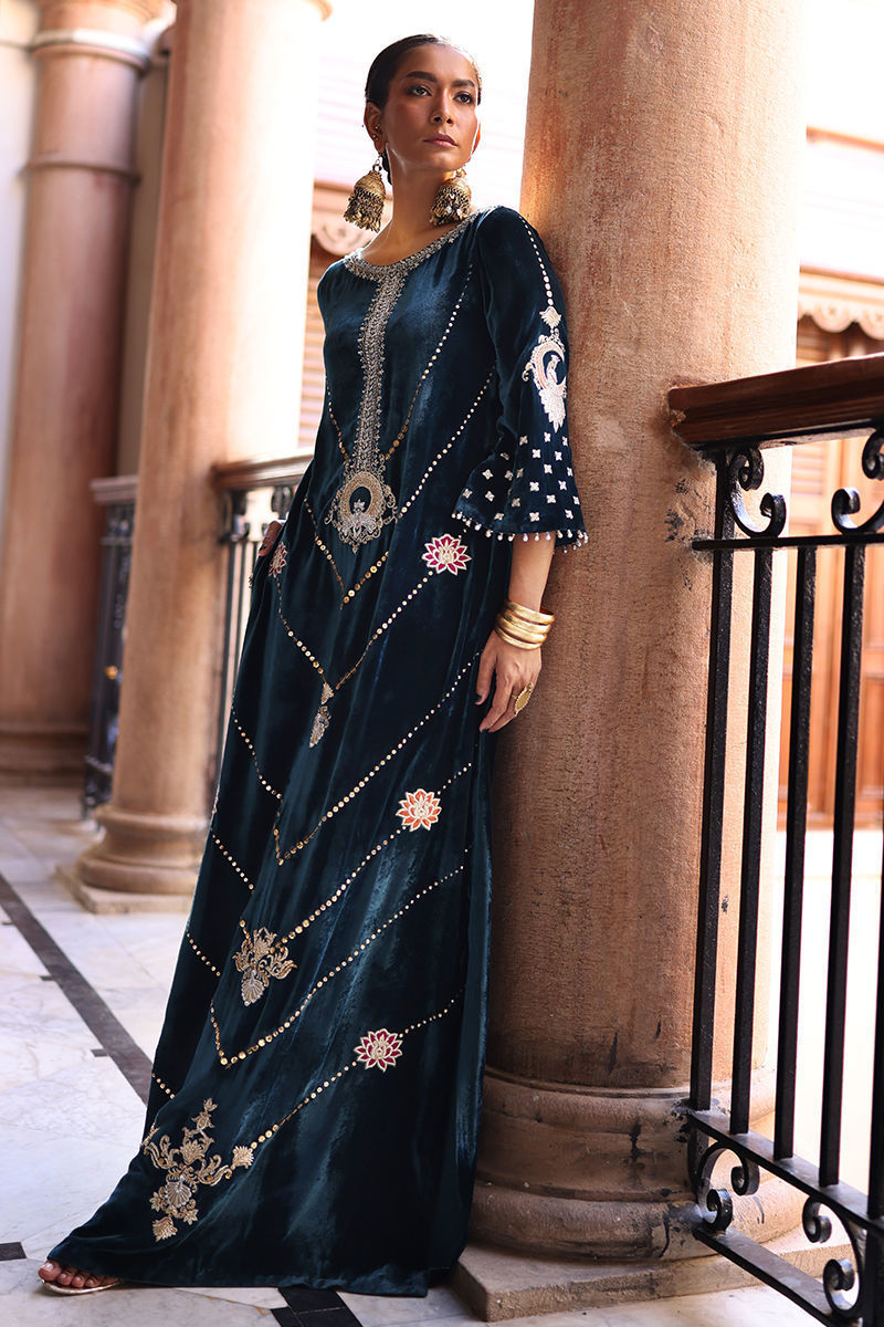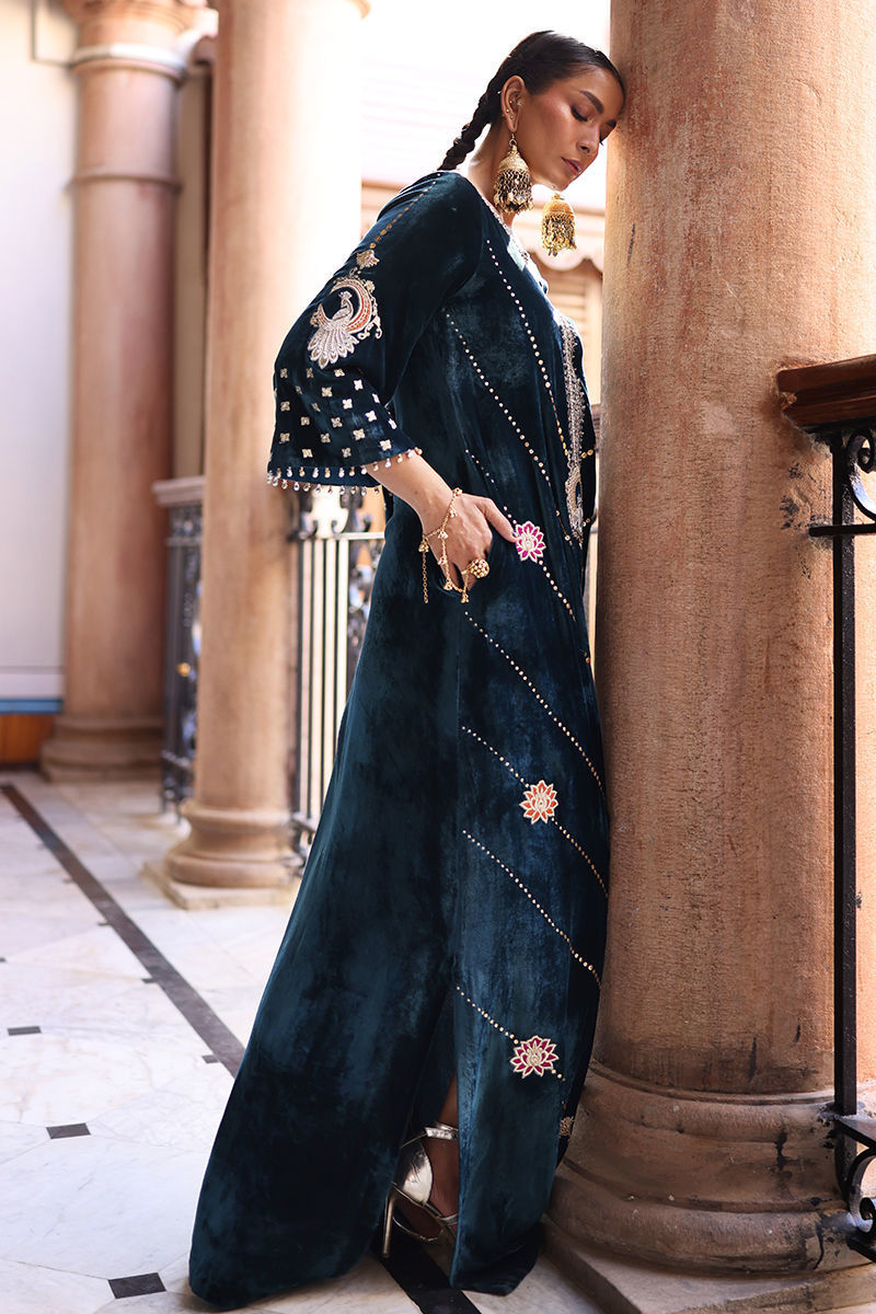 A statement kaftan crafted in luxurious pure velvet, designed with side pockets for a modern touch. The ensemble features exquisite gold and silver zari embroidery with colored appliqué work, beautifully enhanced by intricate handwork of sequins, cutdana, dabka, naqshi, tikki, and stones on the front, back, and sleeves. Delicate gota ball detailing along the sleeve edges adds a playful yet elegant finish. Paired with cotton charmeuse culottes or pants, this Deep Lake ensemble is a perfect blend of contemporary charm and timeless craftsmanship.