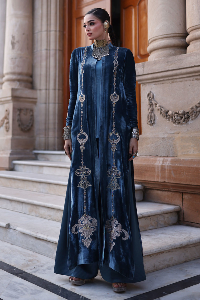 A front-open pure velvet jacket in a serene Copen Blue hue, paired with a matching inner and farshi culottes crafted from cotton charmeuse. The jacket features exquisite silver appliqué work, complemented by gold, antique, and silver zari embroidery. Heavy zardozi embellishments — including imported crystals, dabka, nakshi, stones, cutdana, and moti — adorn the front and sleeves, creating a striking interplay of texture and light. This ensemble captures the essence of timeless luxury and refined craftsmanship.