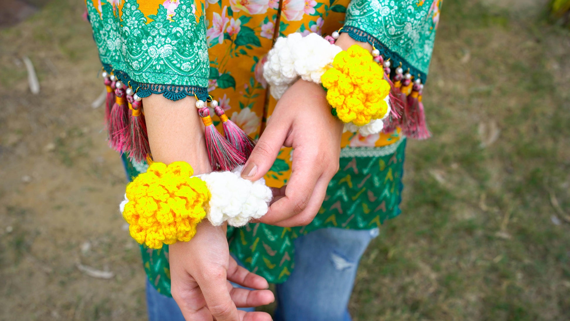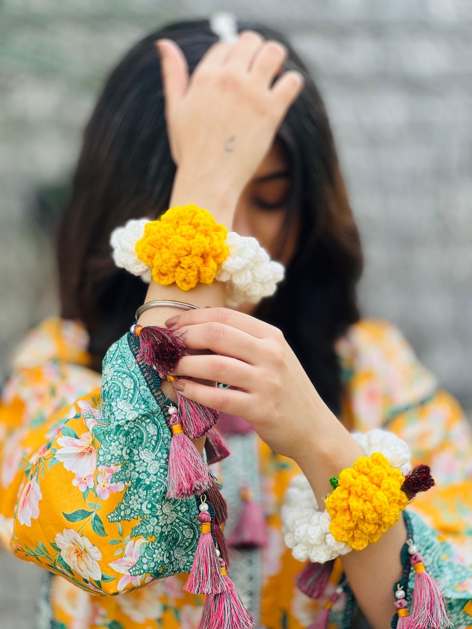 Expertly crafted by hand, our Gajra & Bindi set is a stunning addition to any traditional attire. Made with care and precision, these beautiful accessories add a touch of elegance and culture to your look. Elevate any outfit with our handcrafted Gajra & Bindi.