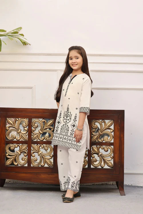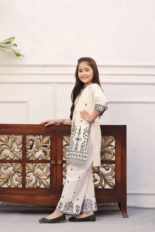 Additional Description: Gender: Girl Outfit Type: Eastern Style: Kurta Set Package Includes: 2 Piece-Top & Bottom Fabric: Pure Cotton Lawn Color Type: White Trouser: Flapper Work Technique: Sequence Embroidery Disclaimer: Actual product color may vary slightly from the image.