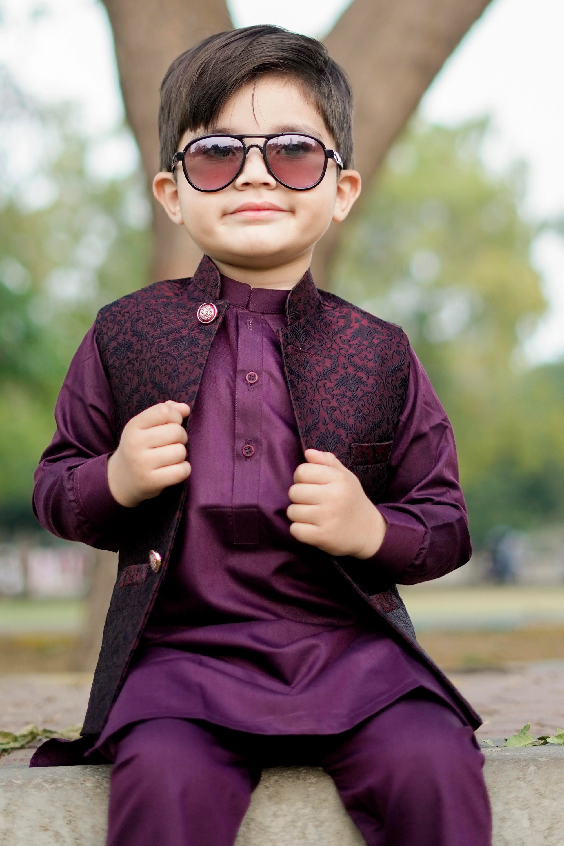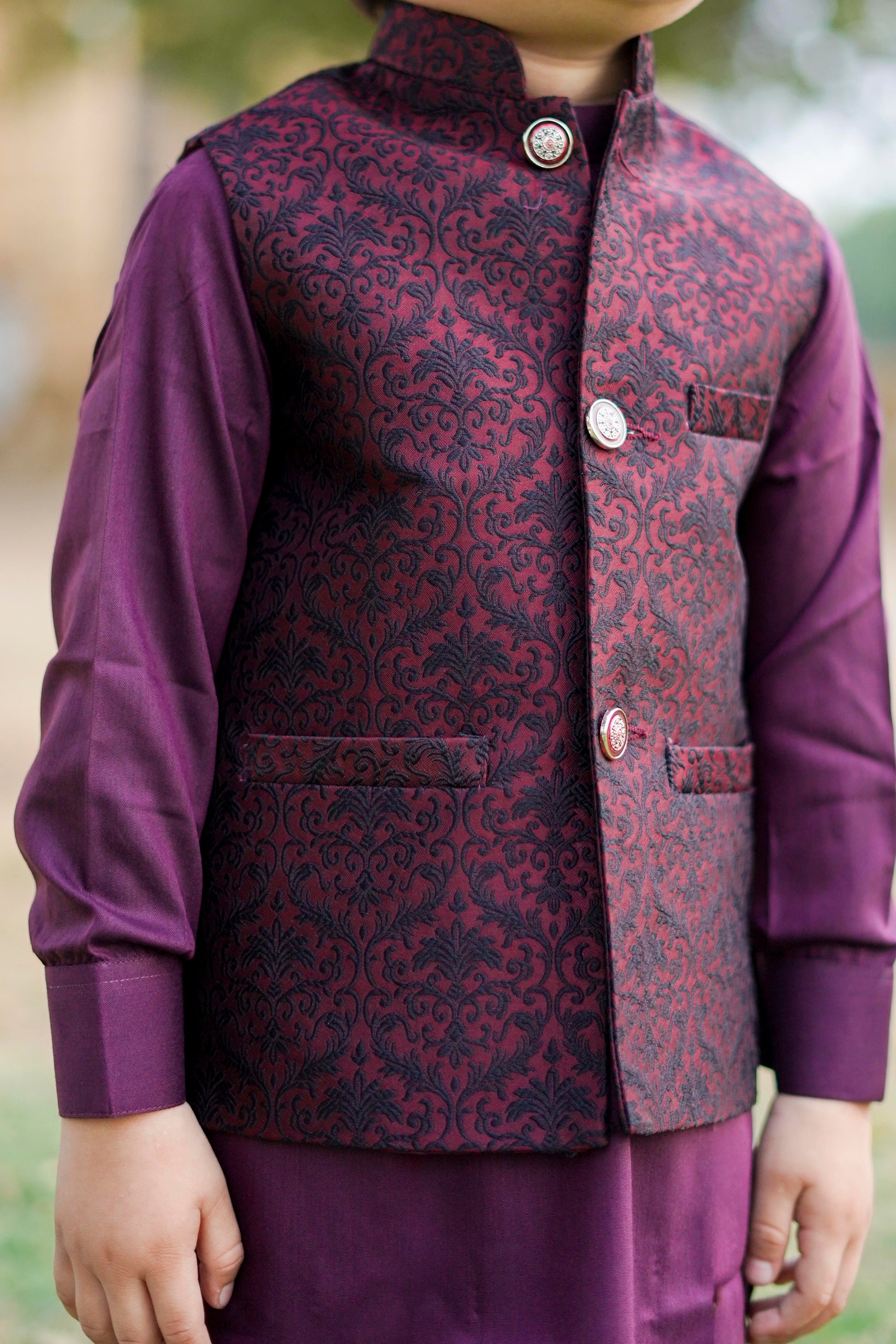 Elevate your child's wardrobe with the Maroon Waistcoat Suit - WKS 017. This sophisticated ensemble features a maroon self-embroidered waistcoat crafted from premium suiting fabric, paired with a classic white kurta and trouser set made from soft wash and wear material. The intricate detailing on the waistcoat adds a touch of elegance, making it an ideal choice for weddings, festive celebrations, or formal events.