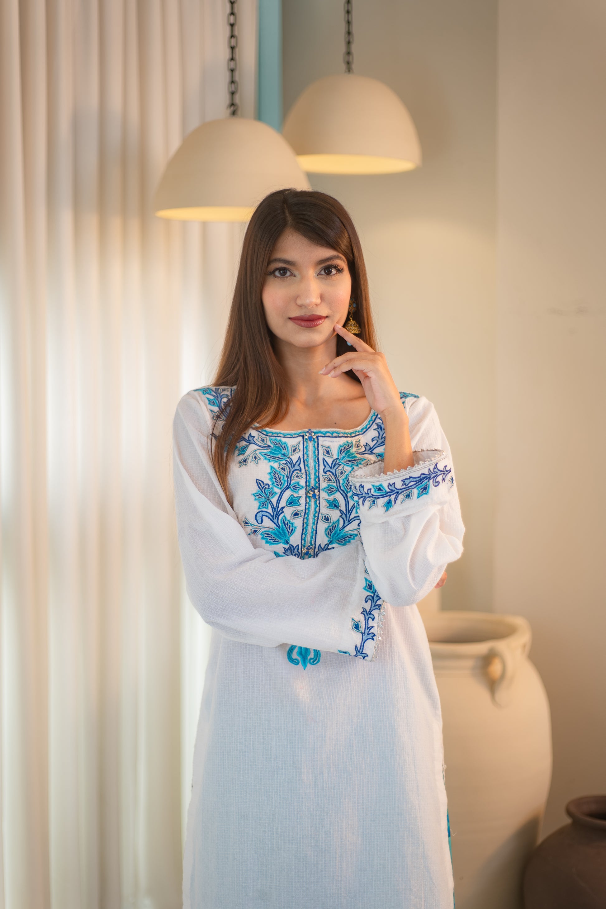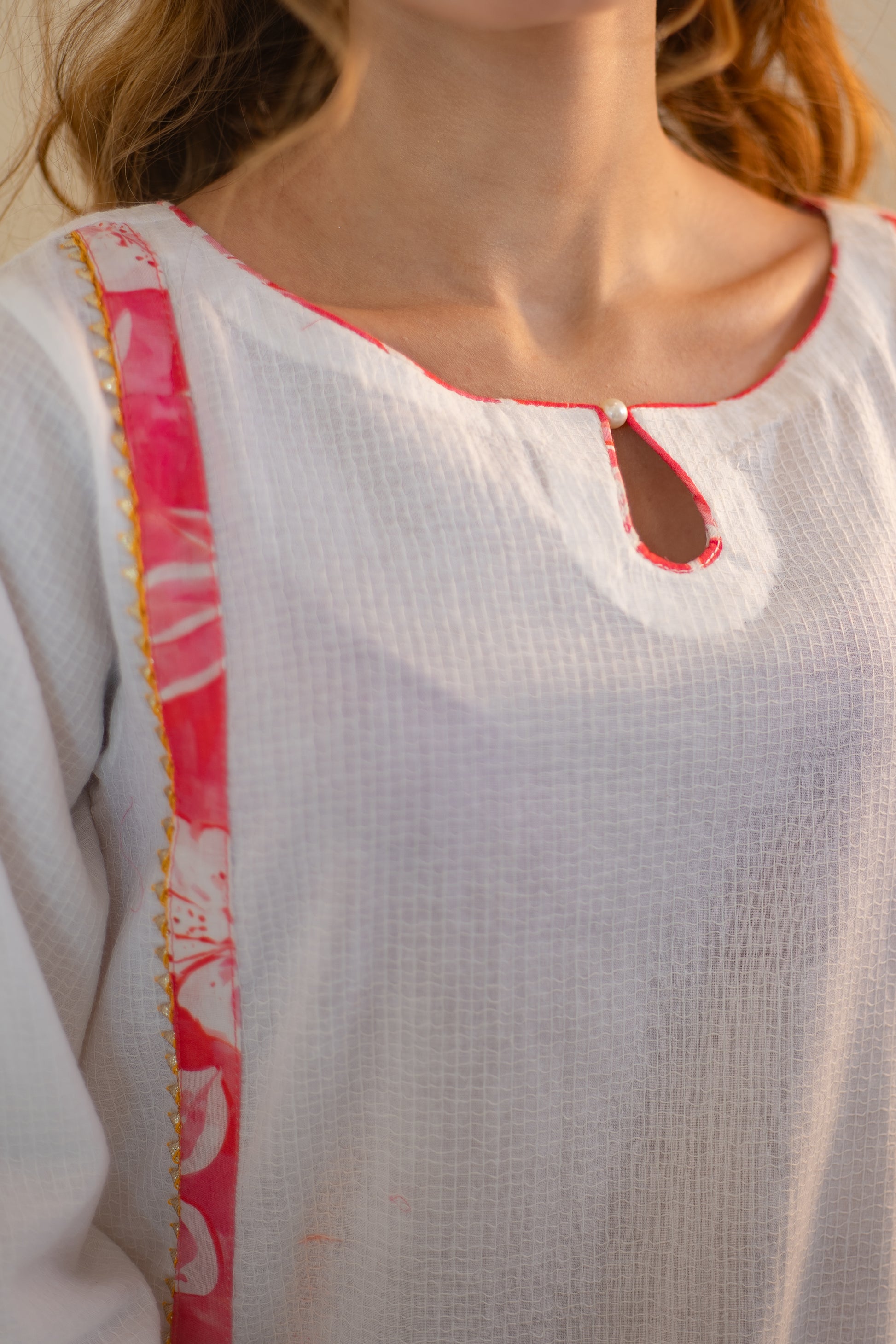 Grace meets tradition in this stunning pink and blue ghara suit, beautifully crafted from premium lawn fabric. The self-print shirt features delicate thread embroidery on the neck and sleeves, finished with gota bail detailing and elegant metal buttons. Paired with a printed lawn ghara, this outfit blends comfort, color, and classic design — perfect for festive or semi-formal occasions.