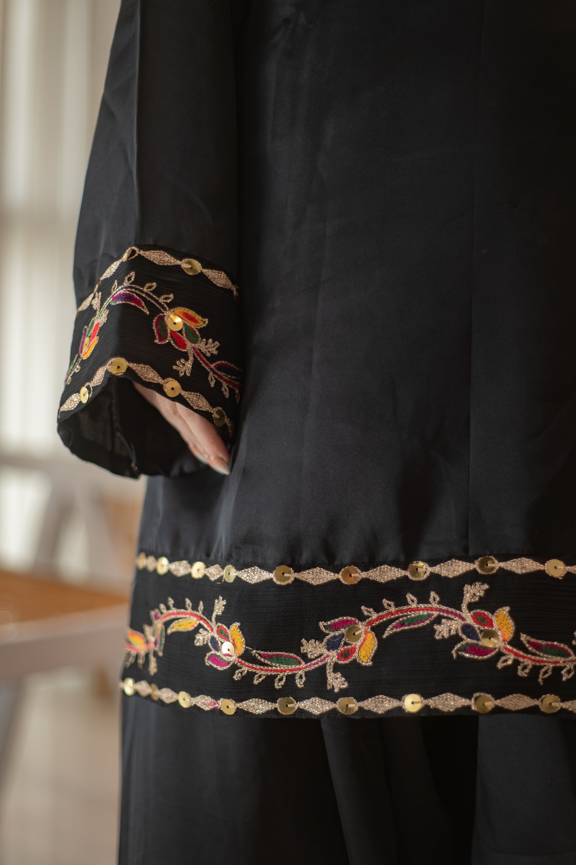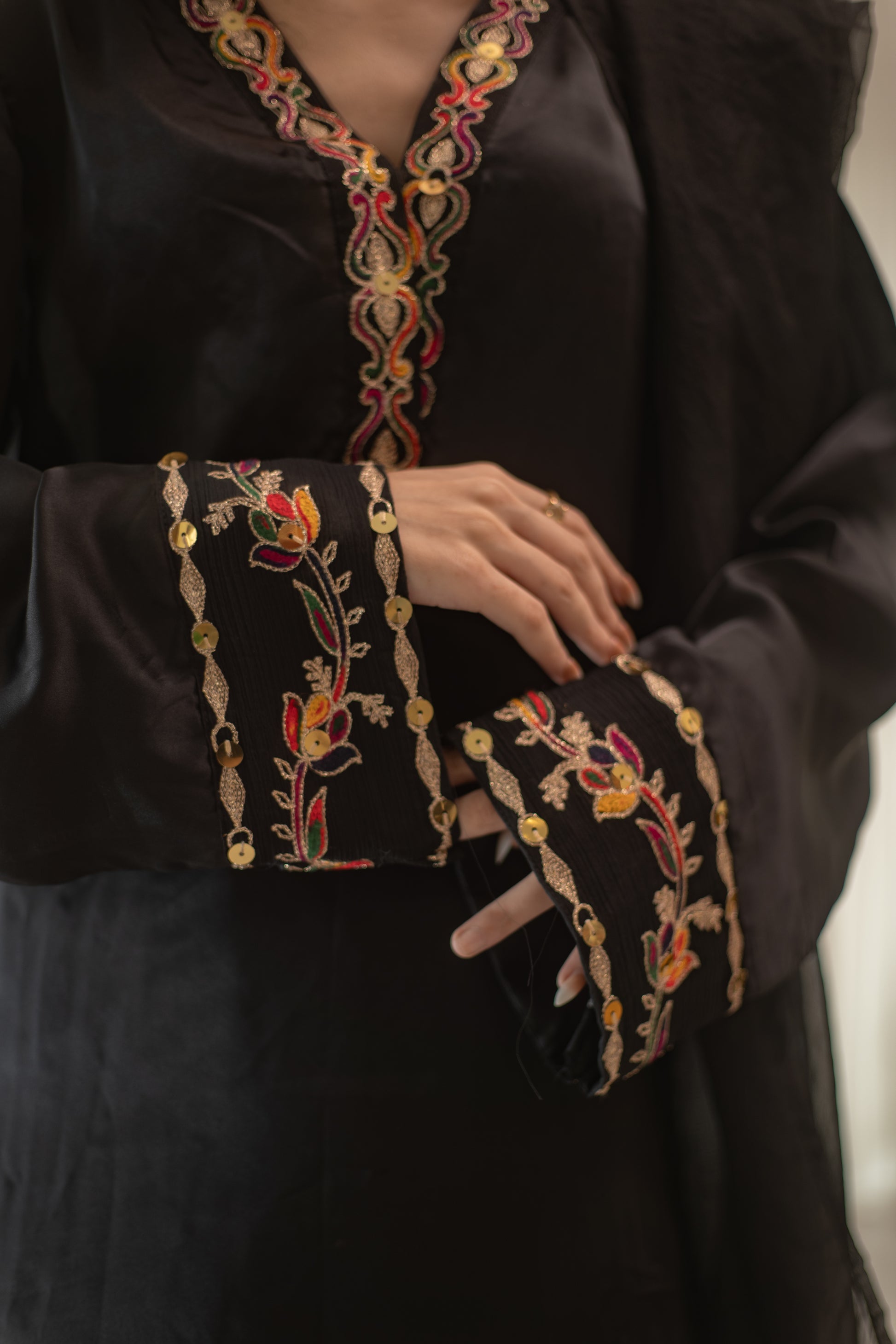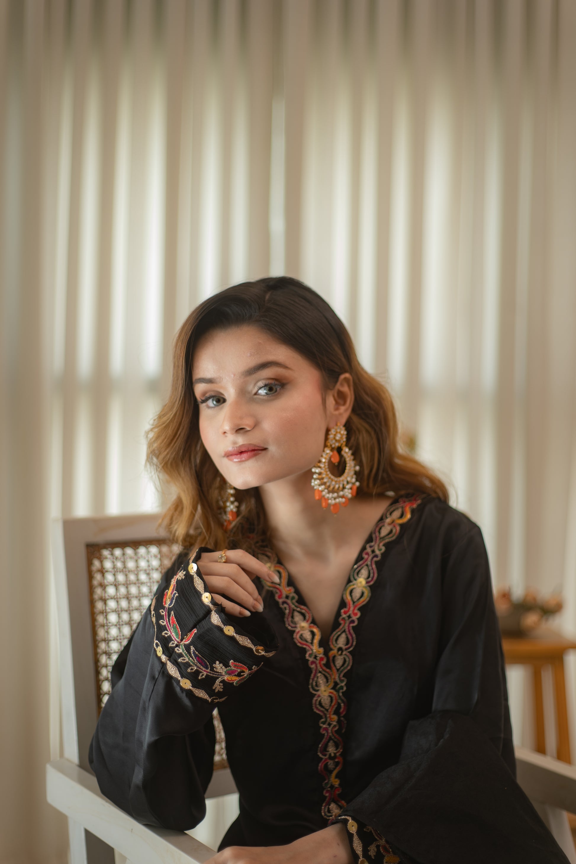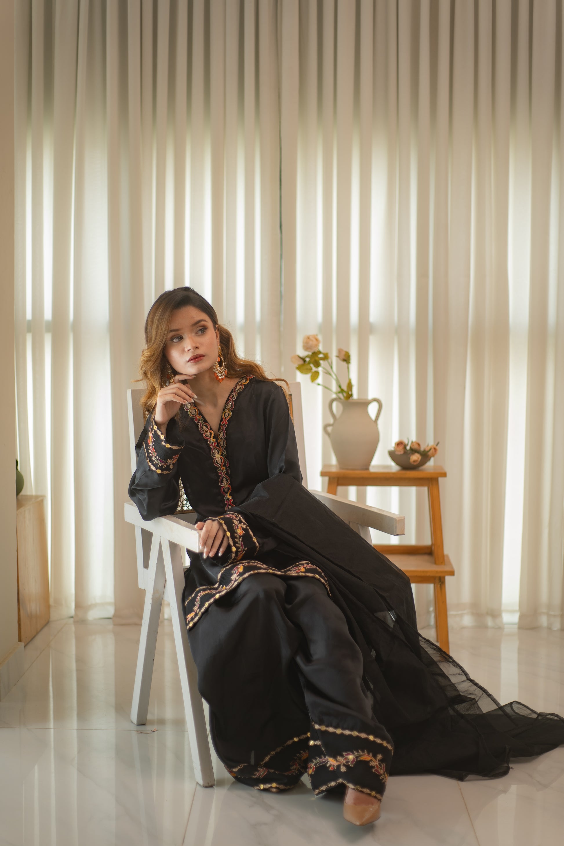 A timeless black shot silk outfit that speaks of effortless elegance. The lustrous silk fabric is enhanced with delicate lace accents, creating a refined look perfect for both festive evenings and formal gatherings. Beautifully stitched with fine craftsmanship, this ensemble ensures a graceful silhouette and lasting comfort.