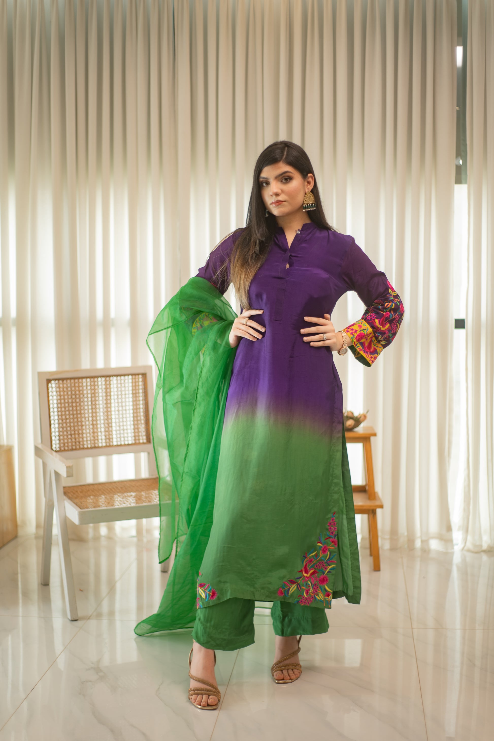 Upgrade your wardrobe with the sophisticated Blue Green Farshi Silk set from Mahaba Studio. This luxurious outfit is a flawless combination of style and opulence, offering quality and availability in one.