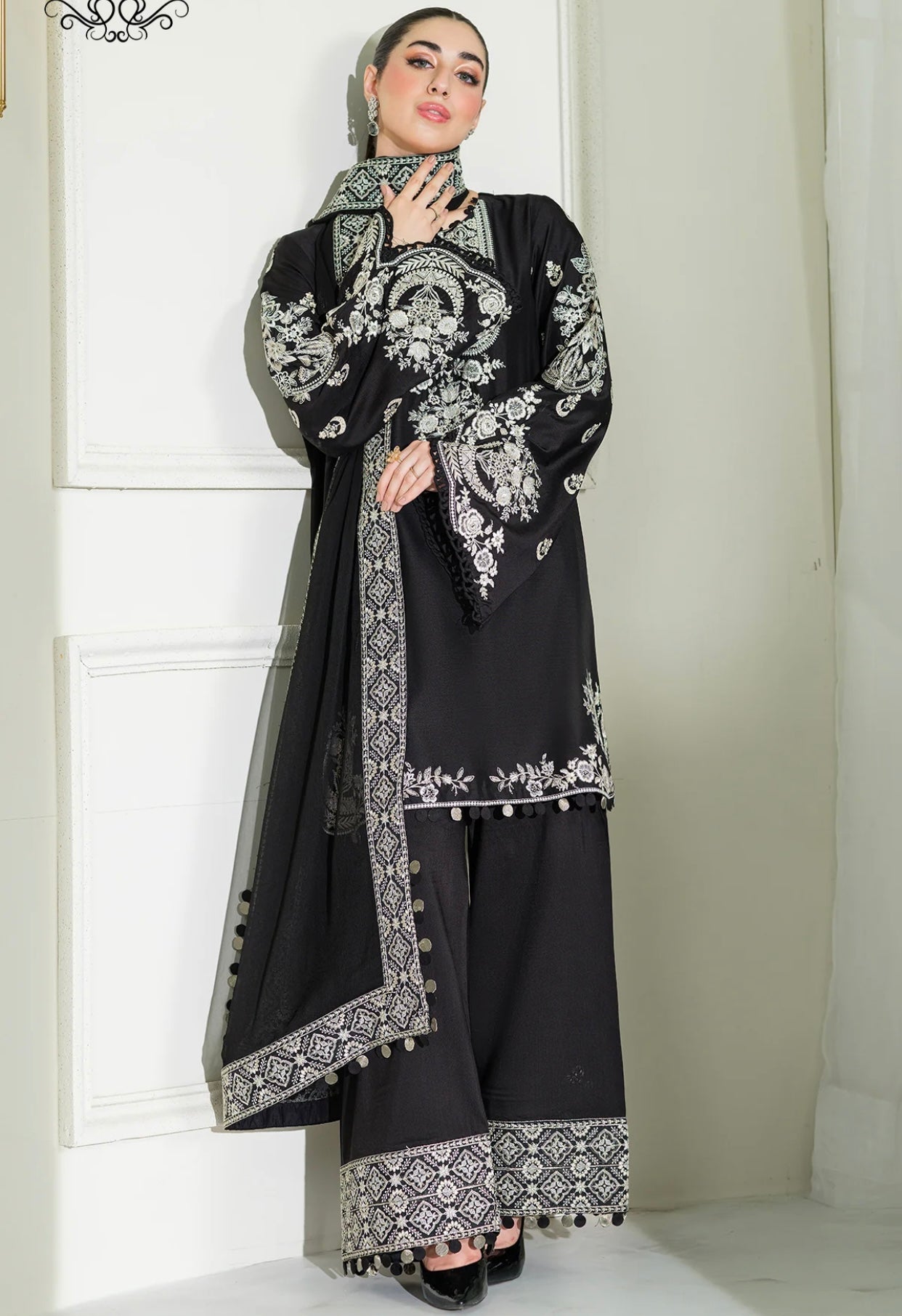 This outfit includes a beautiful embroidered trouser with embellishments on the