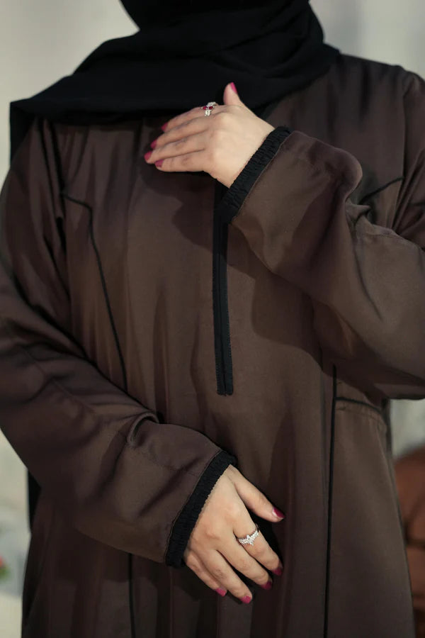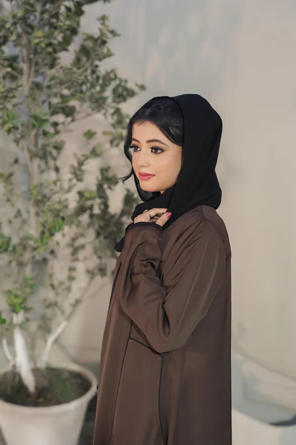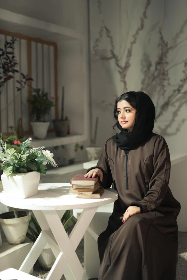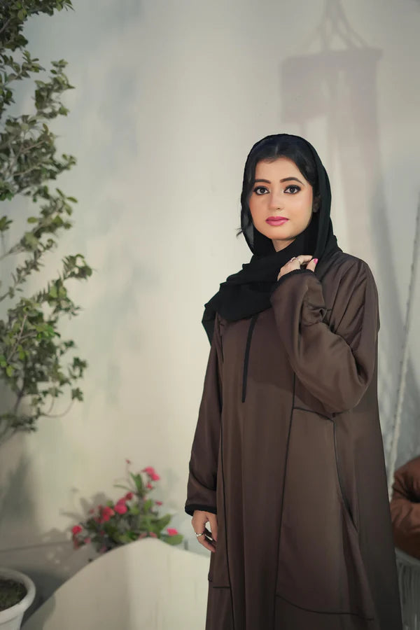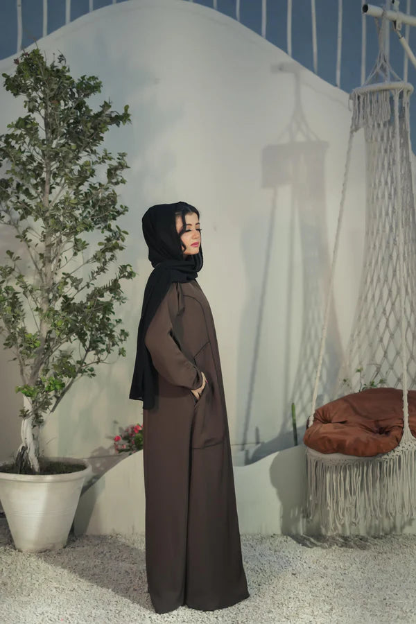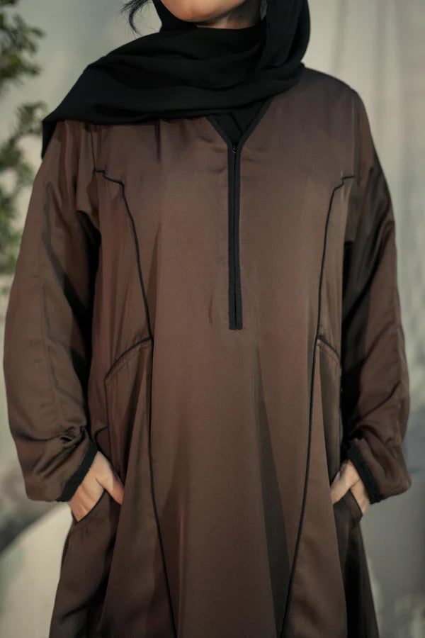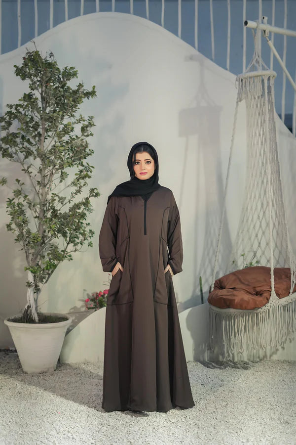 Sports brown abaya, designed for active lifestyles without compromising on style. Crafted with a zip neckline for a modern touch and side panels for added comfort and flexibility, this abaya is perfect for on-the-go activities. The addition of front pockets adds both functionality and style, providing convenience while enhancing the overall look. Elevate your athletic wear with this versatile and practical abaya,