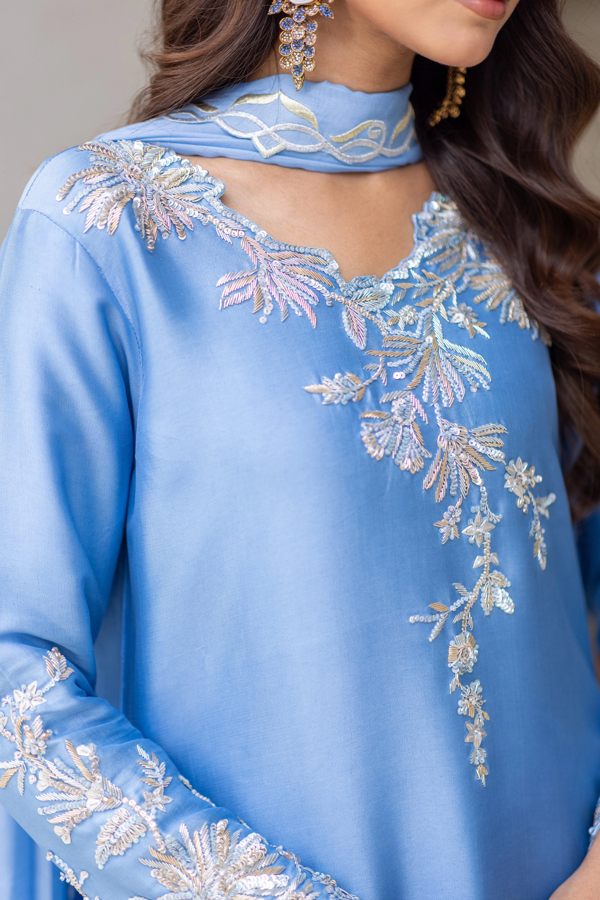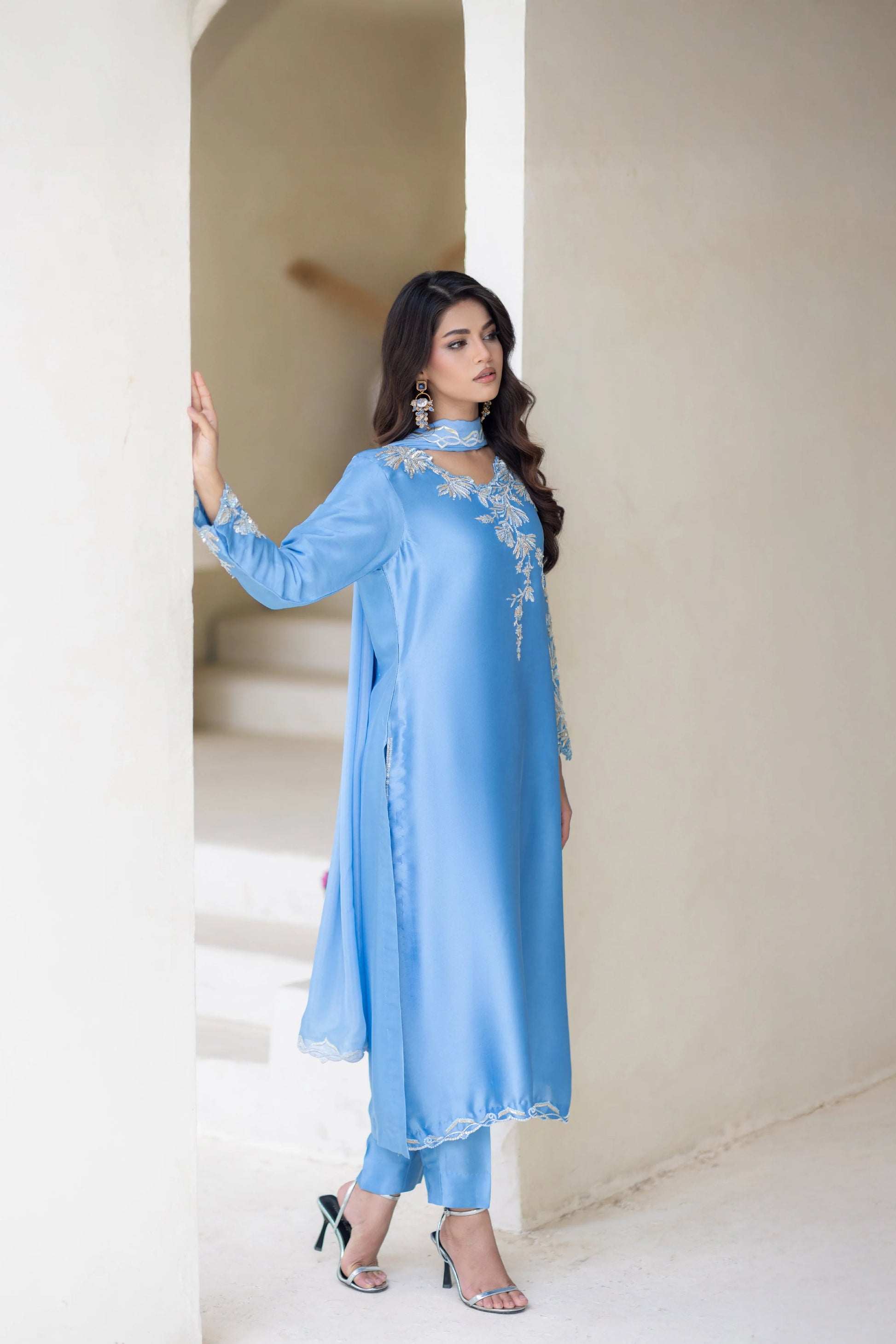 This medium toned Powder blue ensemble is a testament to understated elegance and delicate craftsmanship. The pure silk shirt features a gracefully detailed neckline with subtle embellishments, reflecting timeless sophistication. Full-length sleeves are adorned with intricate floral-inspired zardozi handwork, enhancing its refined charm. The chaak and daman are beautifully accented with delicate scalloped edges, creating a polished and graceful finish. Paired with matching straight trousers and a complementary chiffon dupatta, this ensemble is perfect for any occasion that calls for effortless elegance.