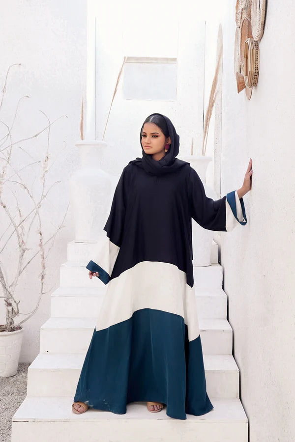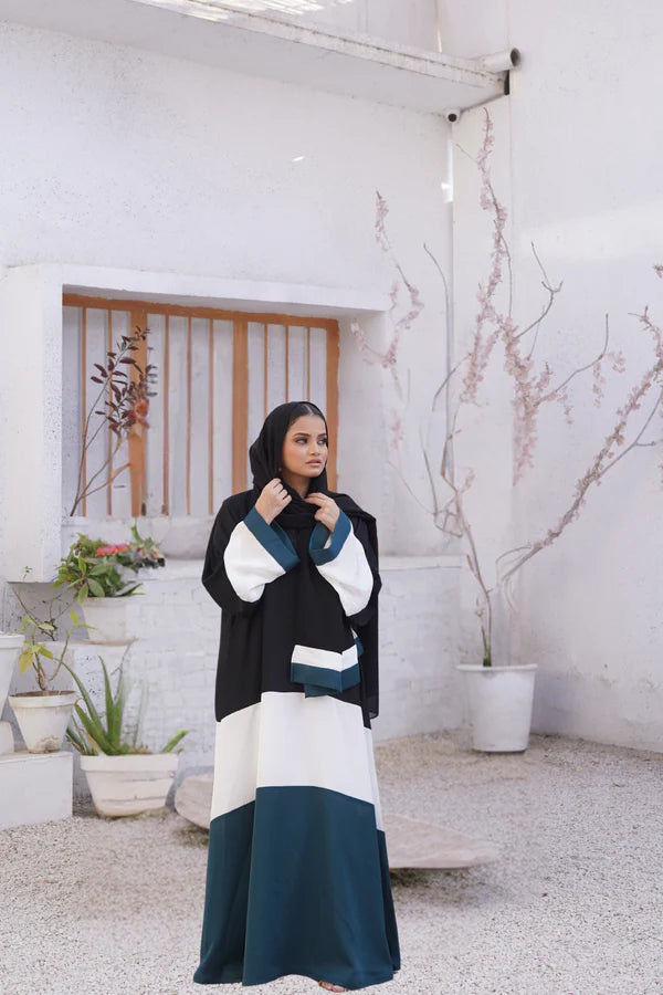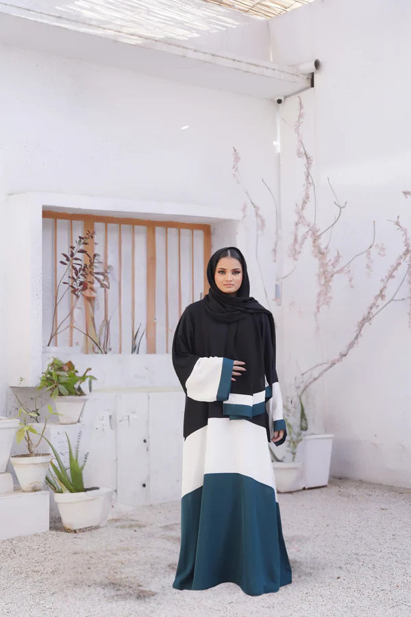 This stylish abaya features a classic front closed maxi design, offering modesty and comfort. The sleek black fabric is beautifully contrasted with off-white and seagreen accents at the bottom, adding a refreshing pop of color, a versatile addition to your everyday wardrobe.