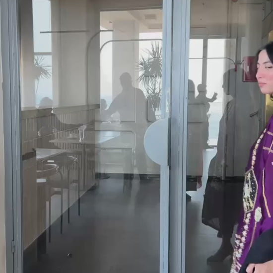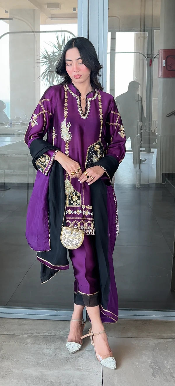 The ensemble is paired with tailored sheesilk pants, featuring matching black applique and delicate goti embellishments ๐ค๐งต, creating a seamless silhouette. Completing the look is a luxurious two-tone silk dupatta adorned with shimmering goti detailing โจ๐, adding fluidity and graceful movement to the ensemble.